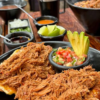 Pan estilo torta de agua rellena de carne de moxiote y queso acompañada de salsas, limones, verdura y nopales a elección