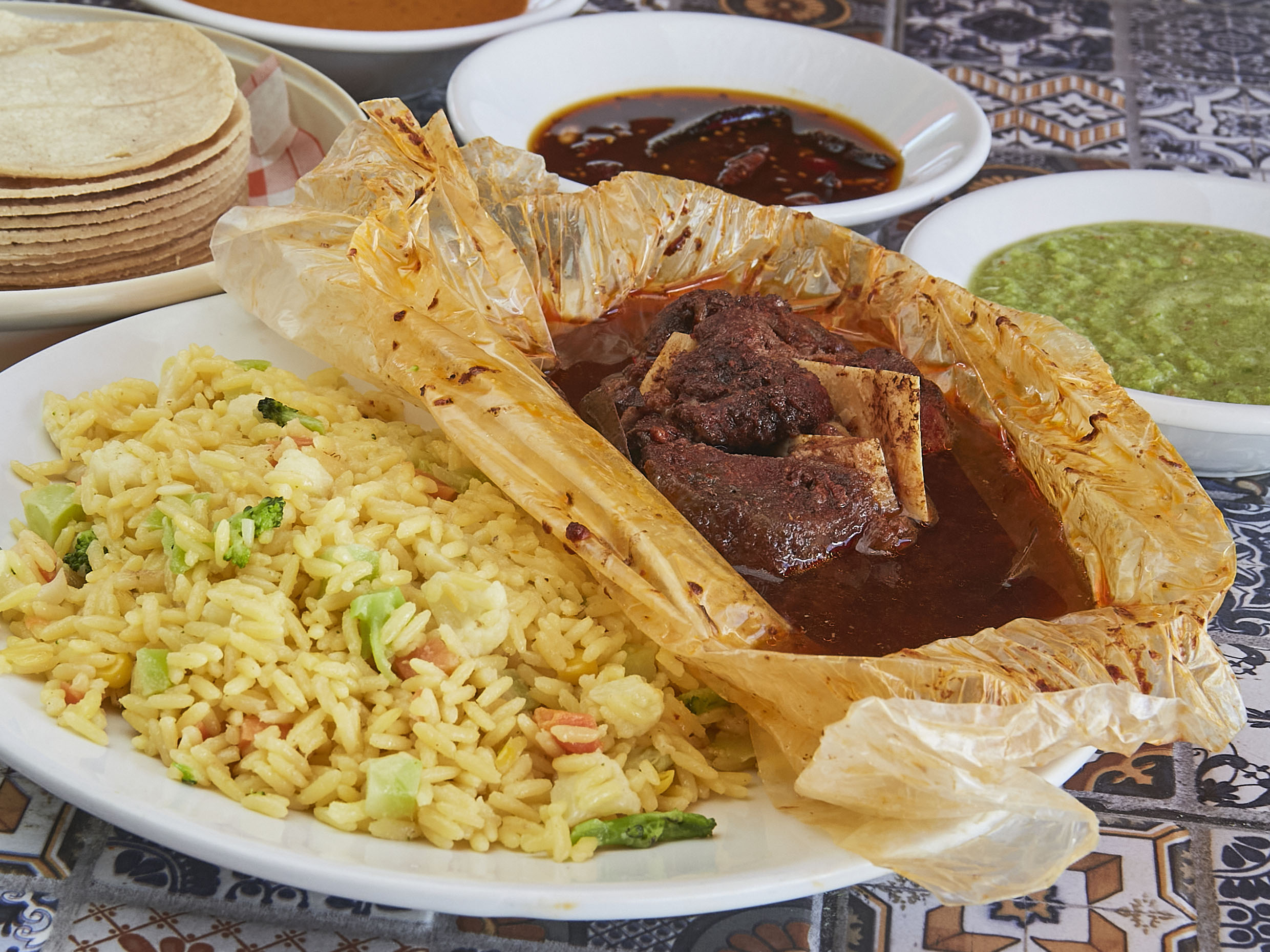 1 charola de arroz, 1 litro de caldo de Birria, 1/2 kilo de tortilla, cebolla, salsa y limones