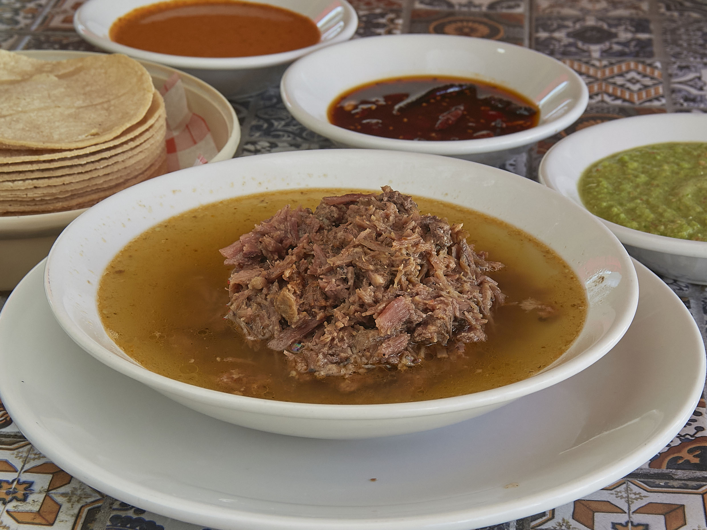 Caldo de birria/ salsas/ cebolla / limones