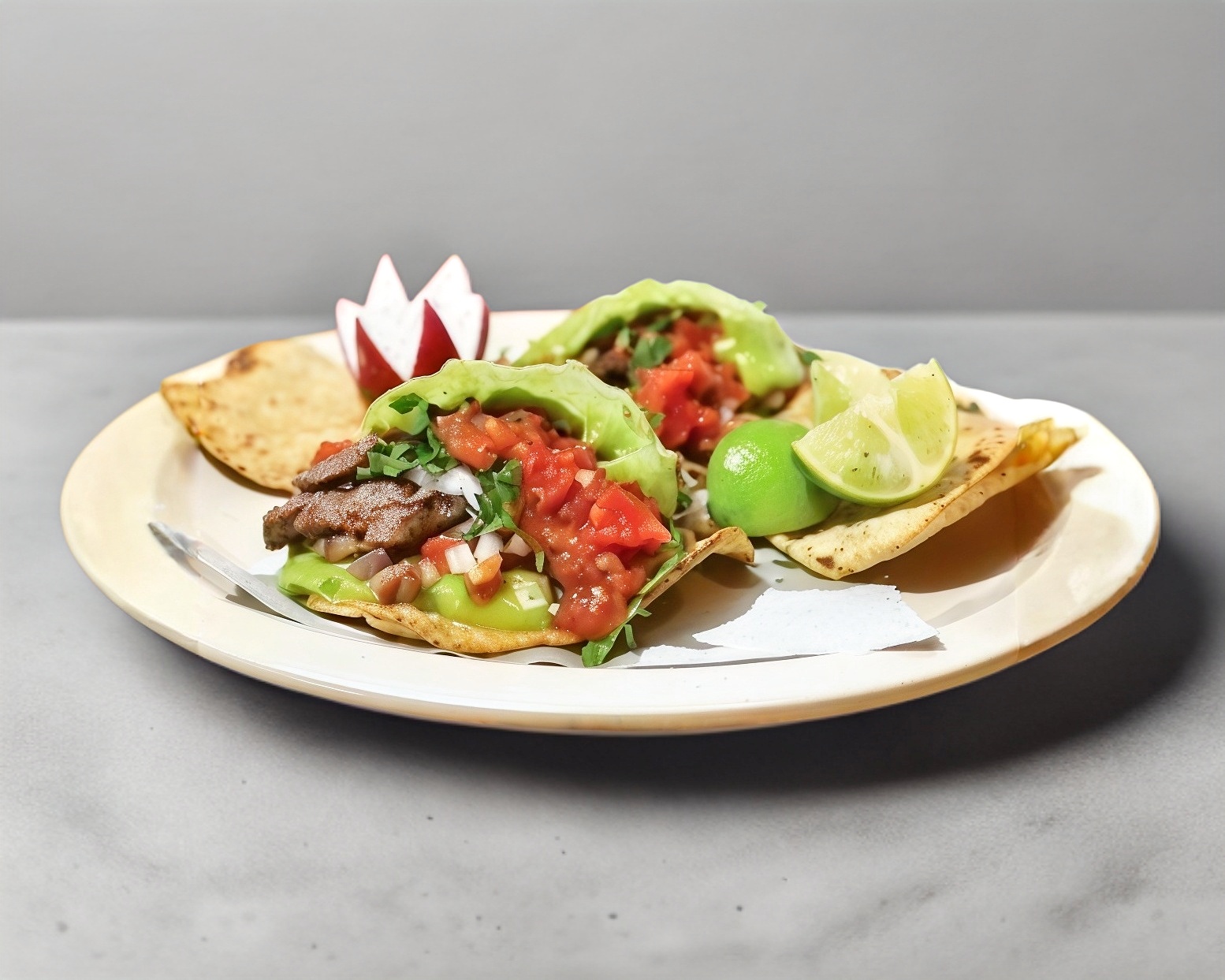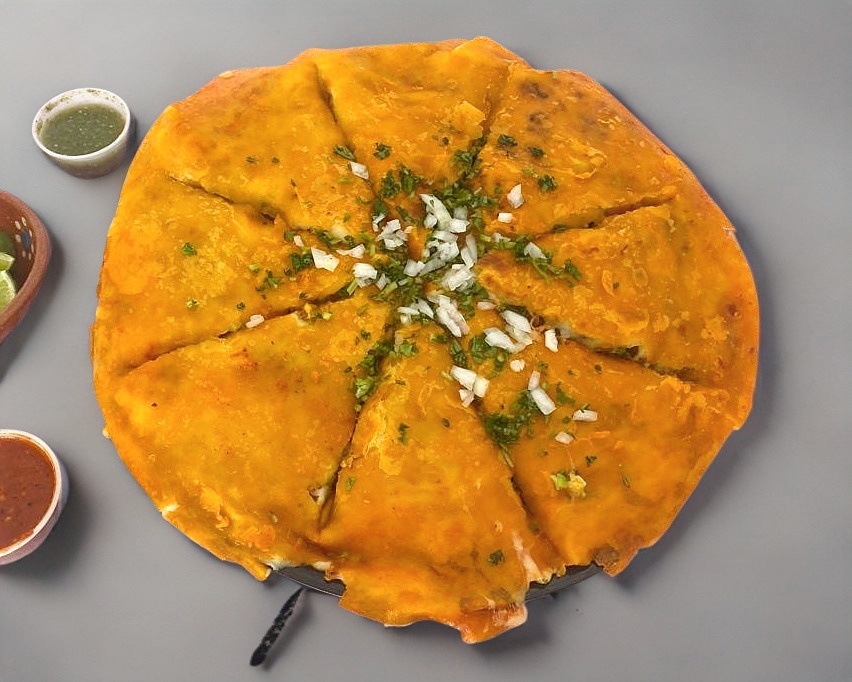 Sincronizada doble tortilla de harina (35cm) con carne, queso, cilantro y cebolla.