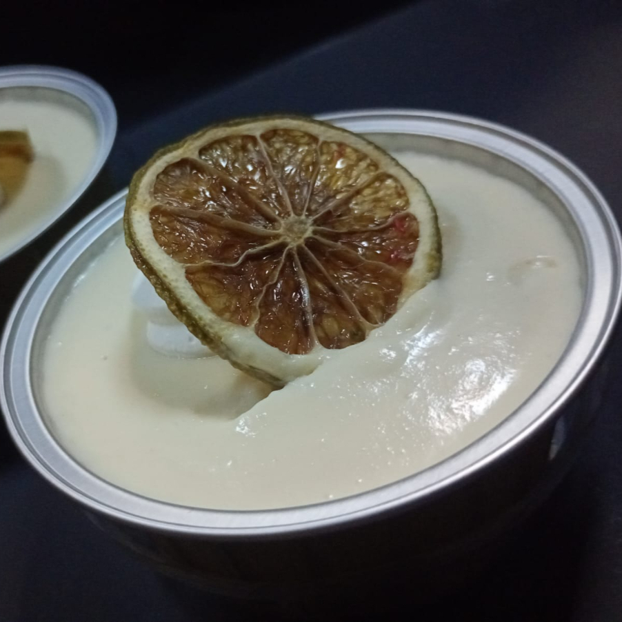 Delicado postre en capas de galleta y suave crema de limón, coronado con crema batida y una fina lámina de limón deshidratado.