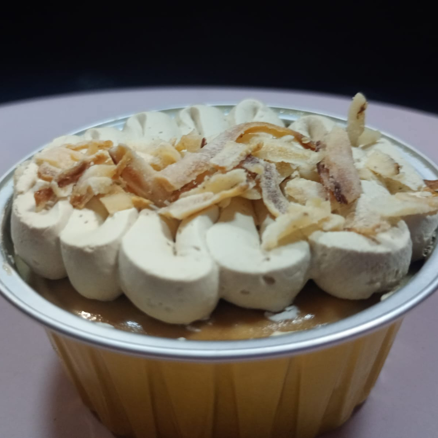 Sutil equilibrio entre el aroma del café y la textura cremosa, con capas de galleta y un acabado de crema de café, decorado con coco tostado.