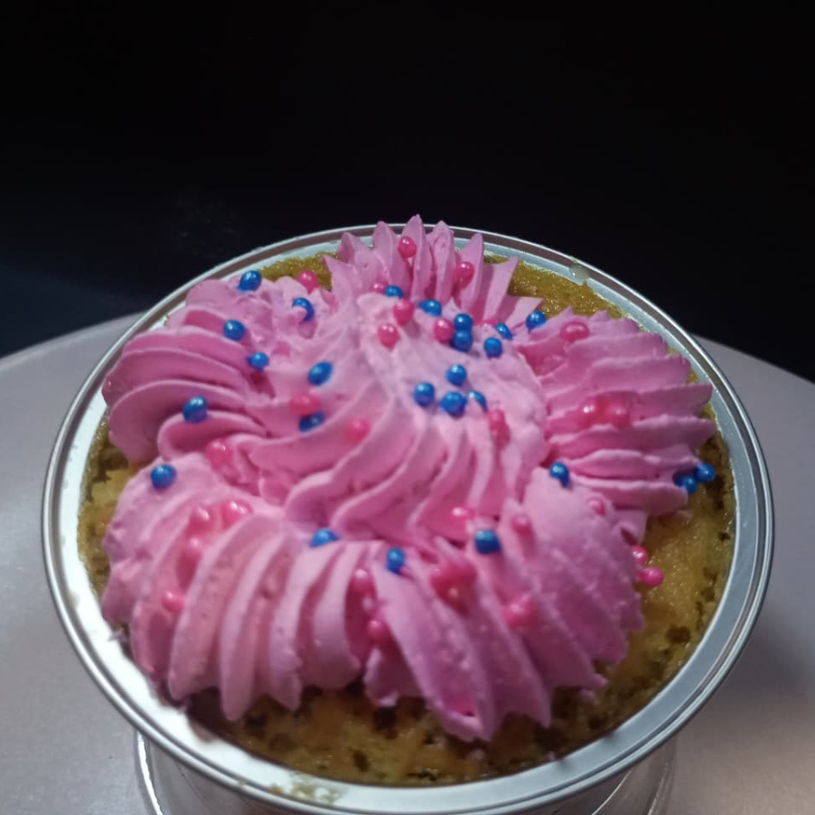 Esponjoso bizcocho de vainilla envinado, cubierto con crema ligera y decorado con un toque de chispas de colores.