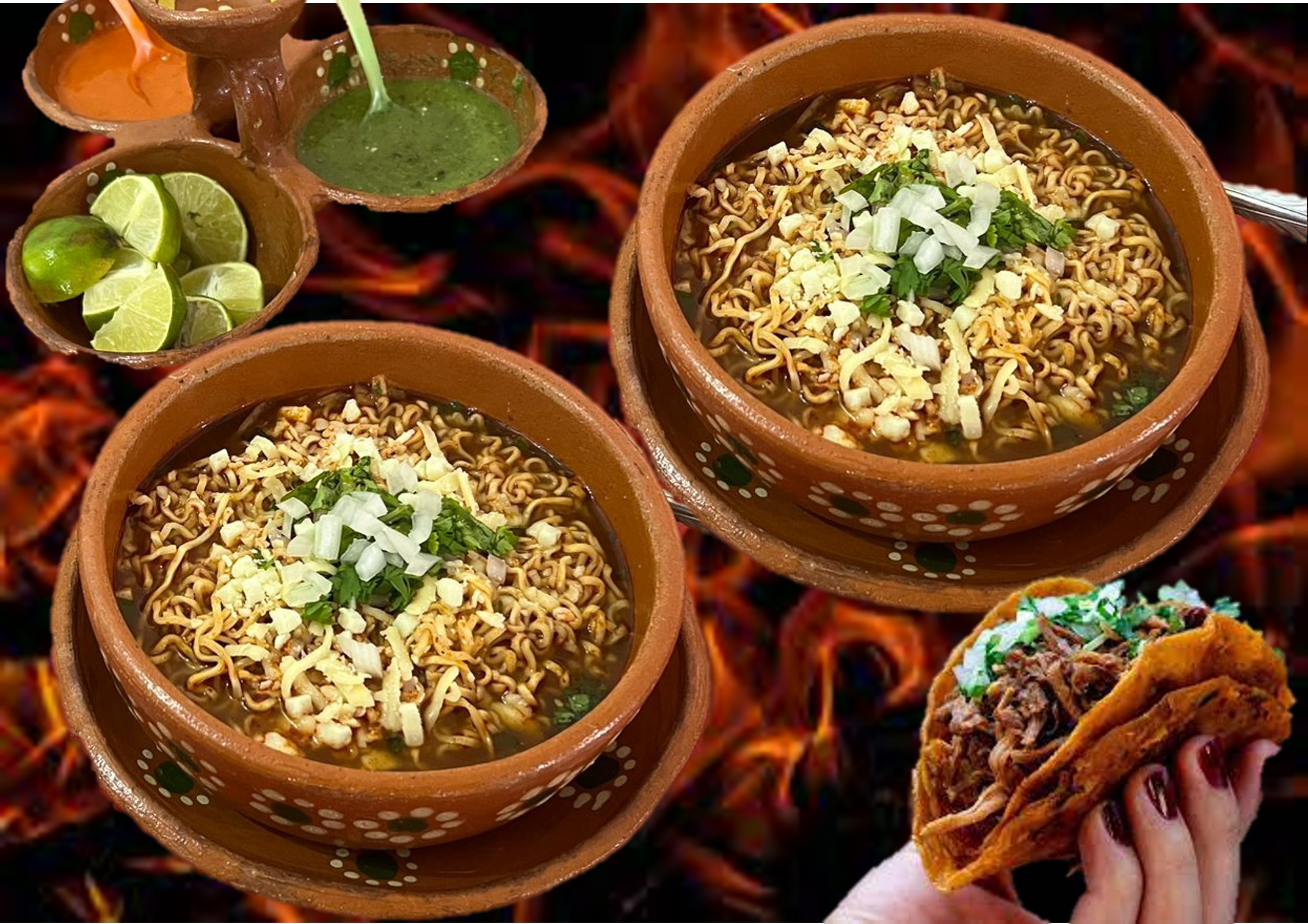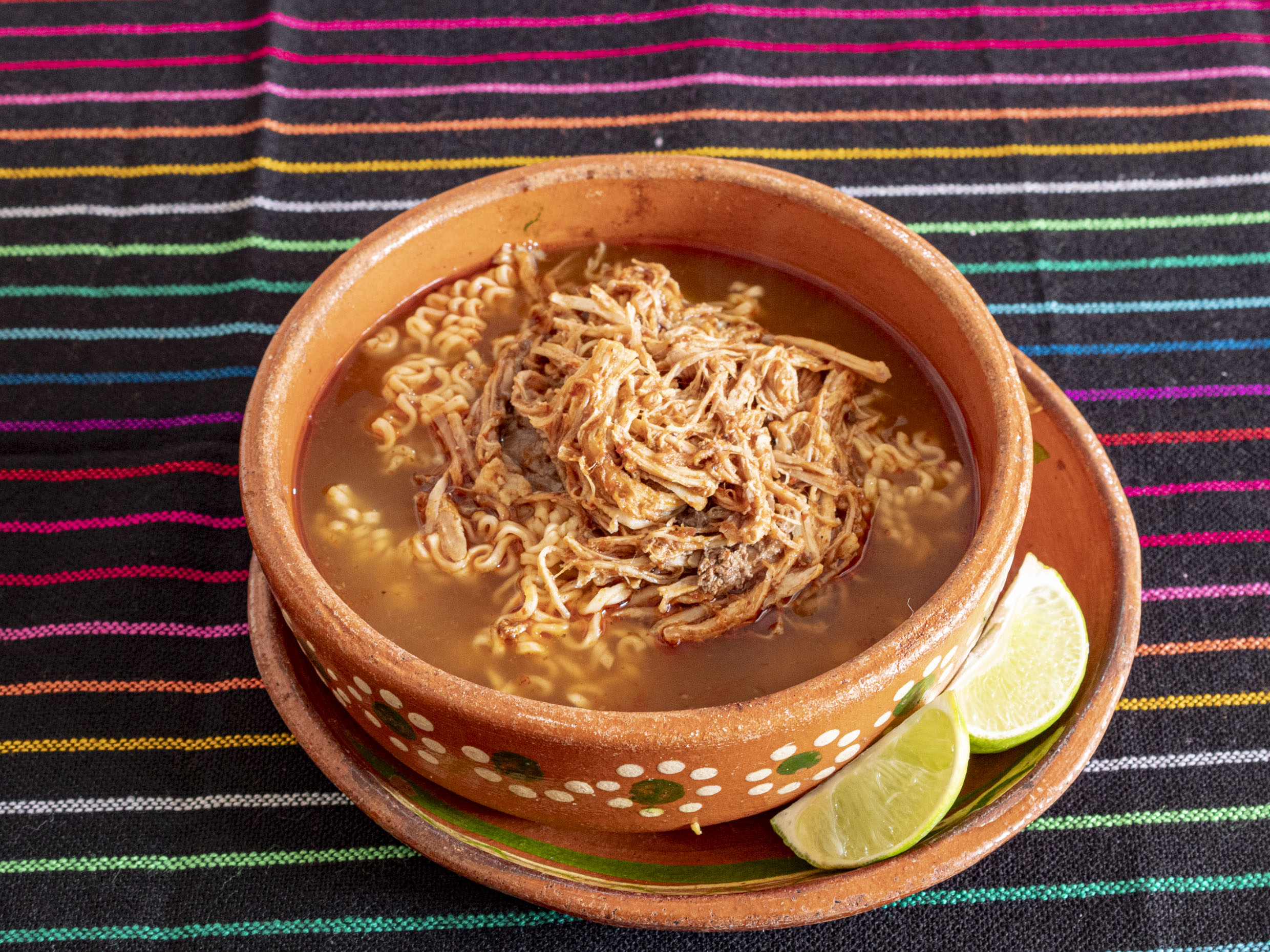 Pasta de Ramen en Consomé y Carne de birria, cilantro y cebolla (500ml).