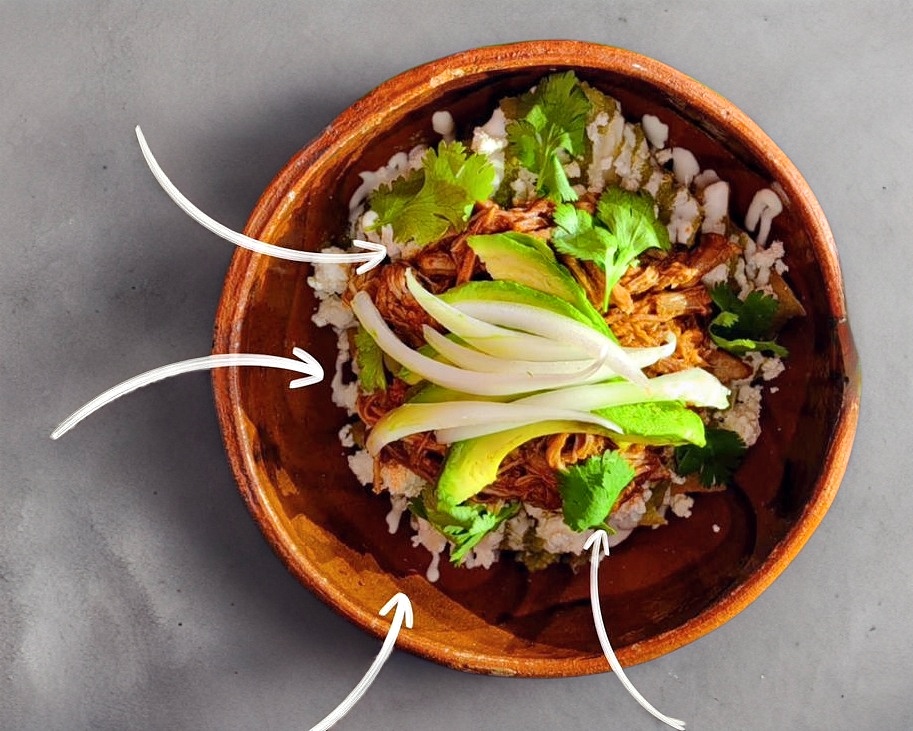 Deliciosos chilaquiles en salsa verde con carne de birria de res, cilantro, cebolla, crema y queso.