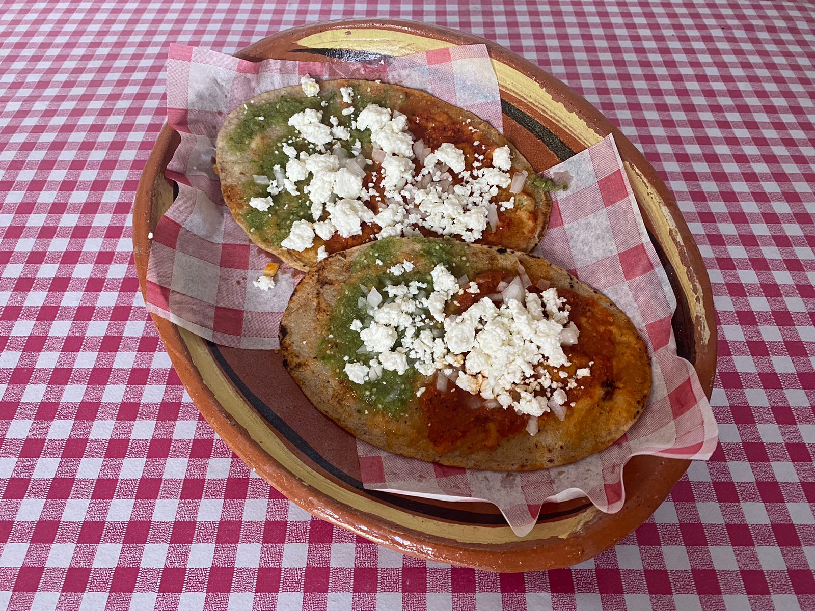 Memela con salsa verde o roja, carne de birria, cilantro y cebolla.