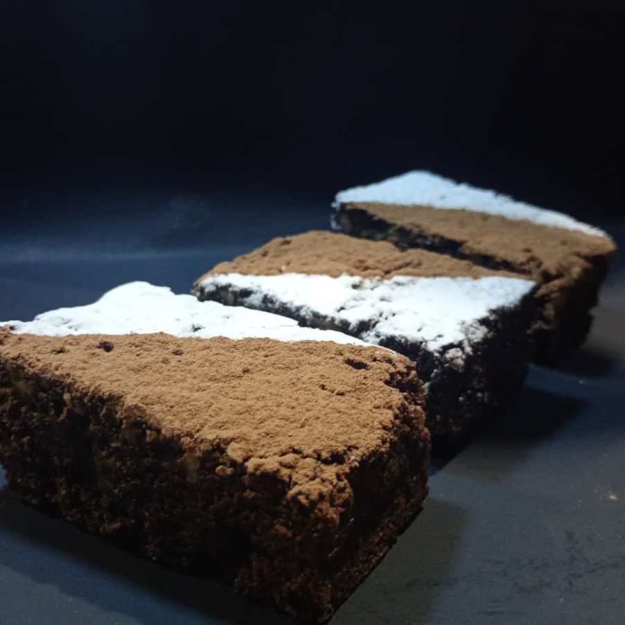 Irresistible brownie de textura densa, con nuez troceada y un delicado acabado de cocoa y azúcar glass.