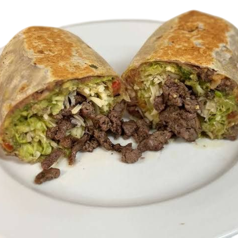 Tortilla de harina, carne asada con chorizo, frijoles, arroz, queso mozarella, salsa guacamole y verdura.