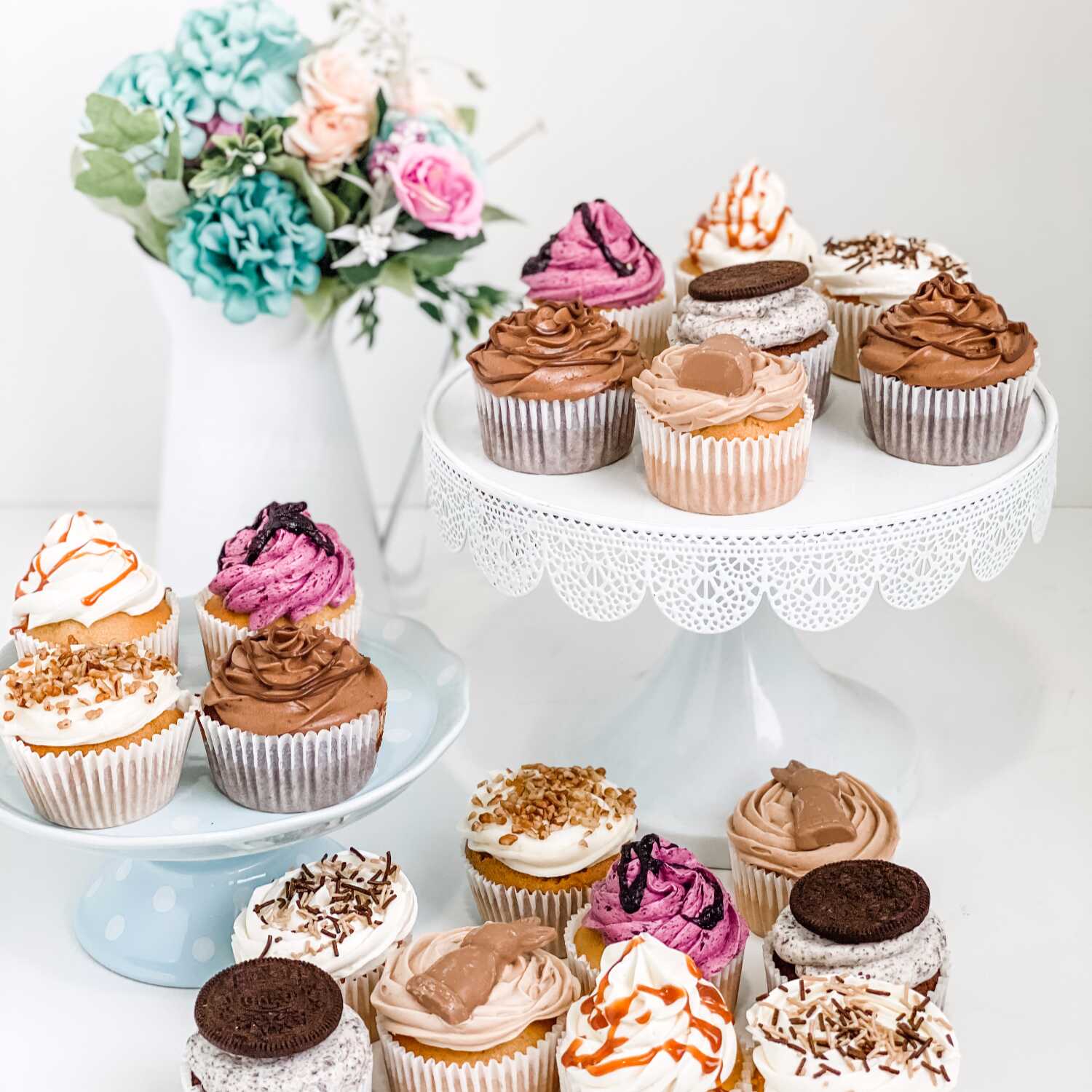 Cupcakes de pan de vainilla cubiertos de buttercream, rellenos con uno de nuestros sabores a elección.