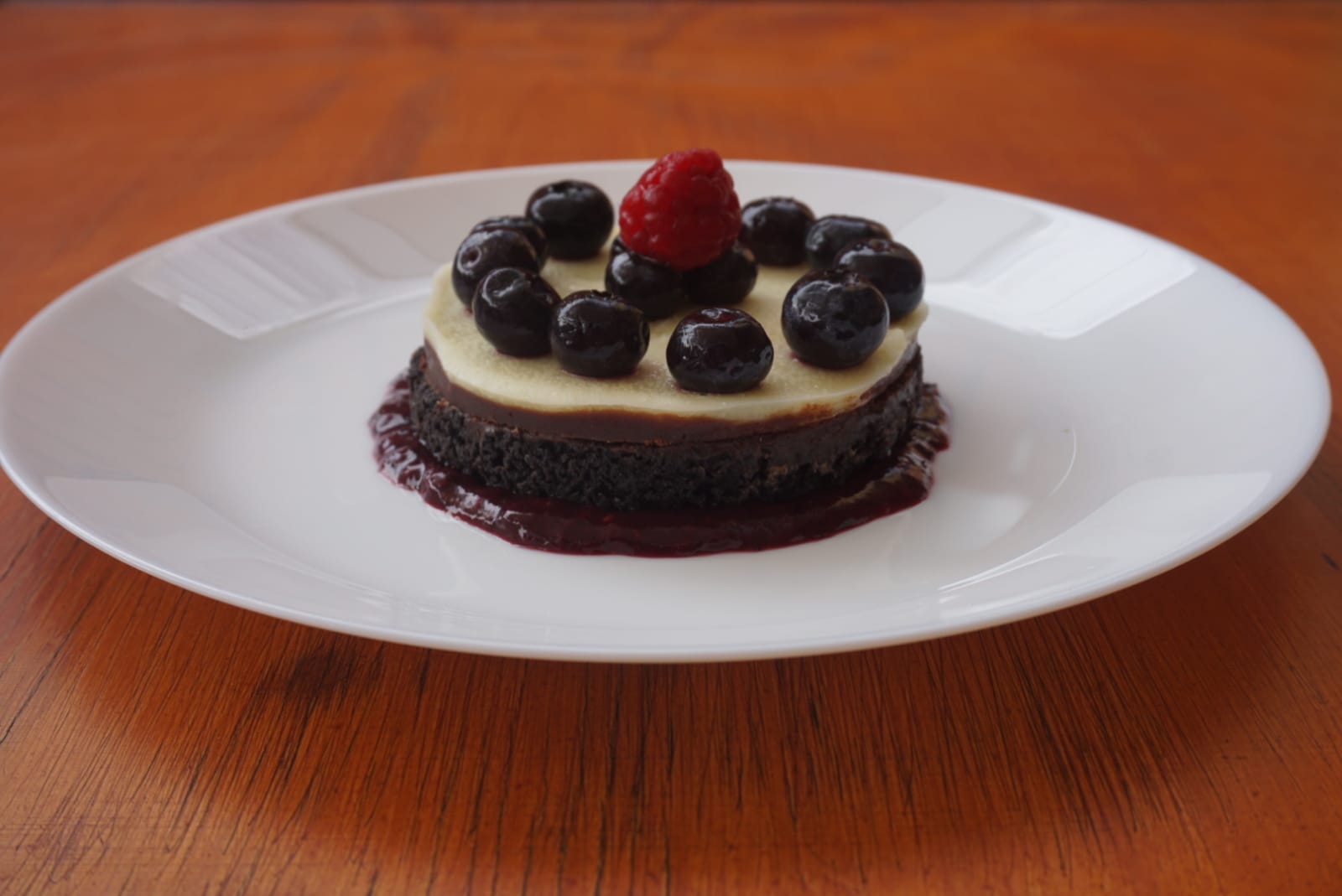 Tartaleta de galleta, con ganache de chocolate oscuro y blanco, acompañado con mermelada de frutos rojos.