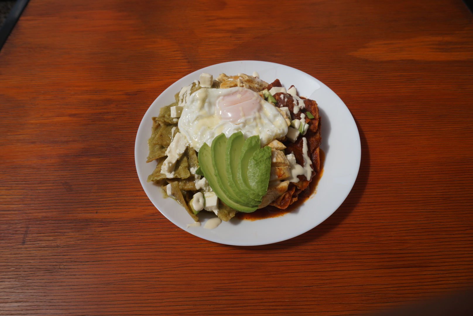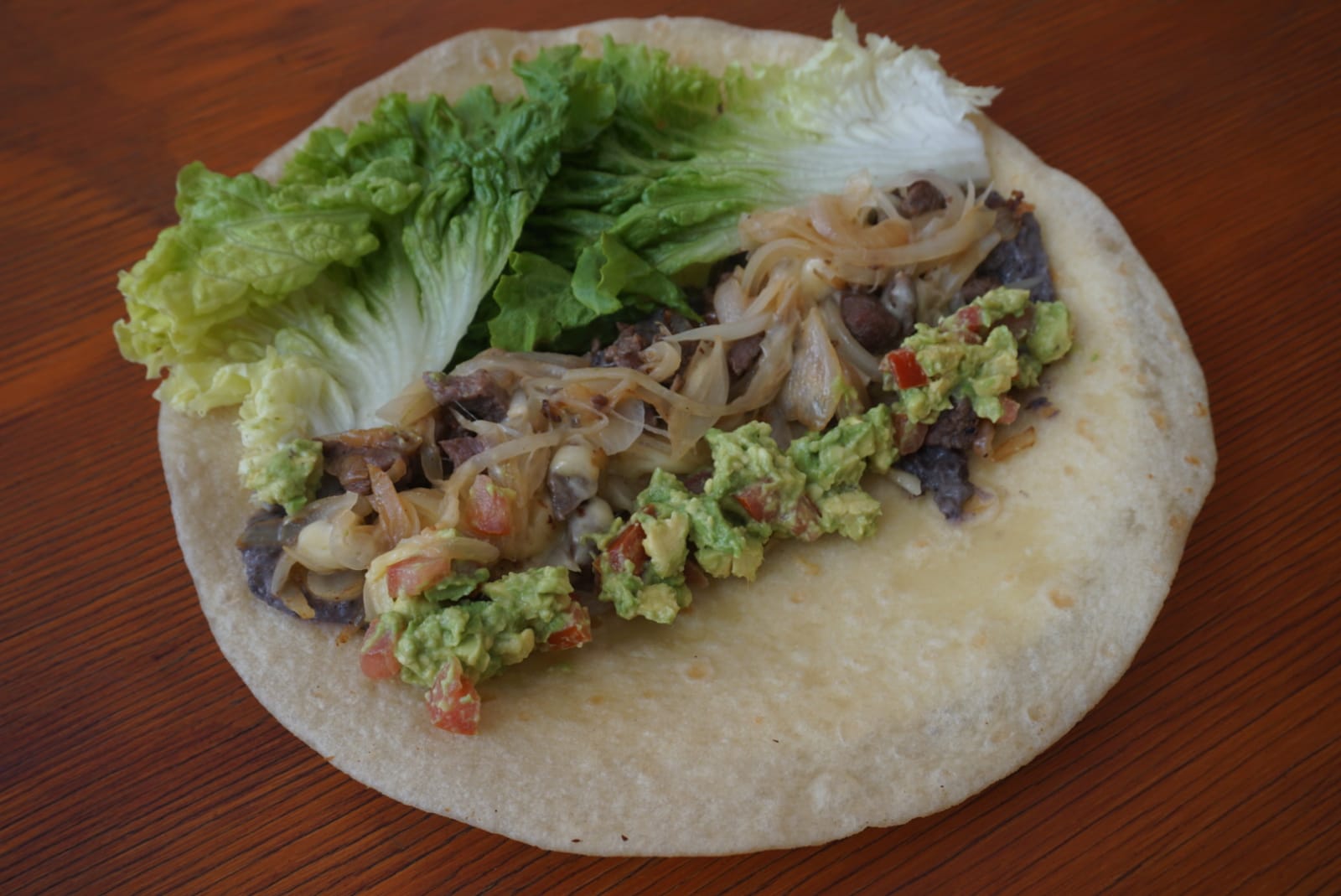 Pan pita hecho en casa con queso gouda y jamón. Acompañada de frijoles refritos y guacamole.