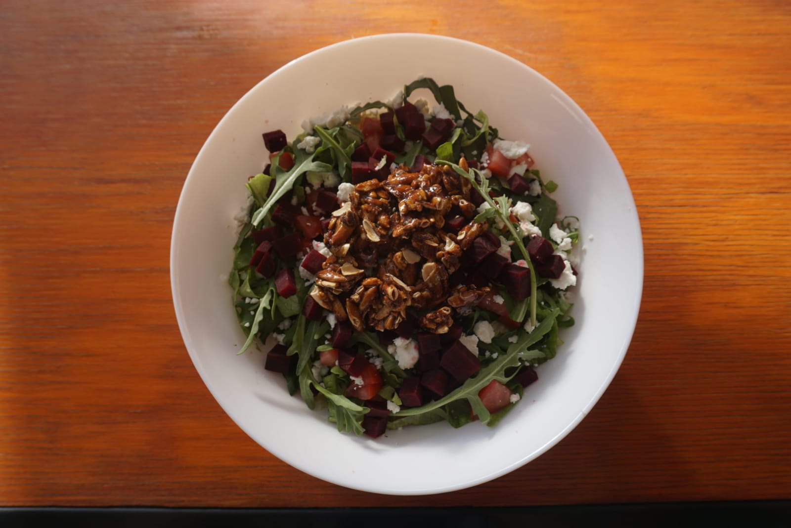 Base de espinacas, arúgula, queso de cabra, semillas caramelizadas, betabel rostizado. A tu elección: aderezo de balsámico o vinagreta de mostaza.