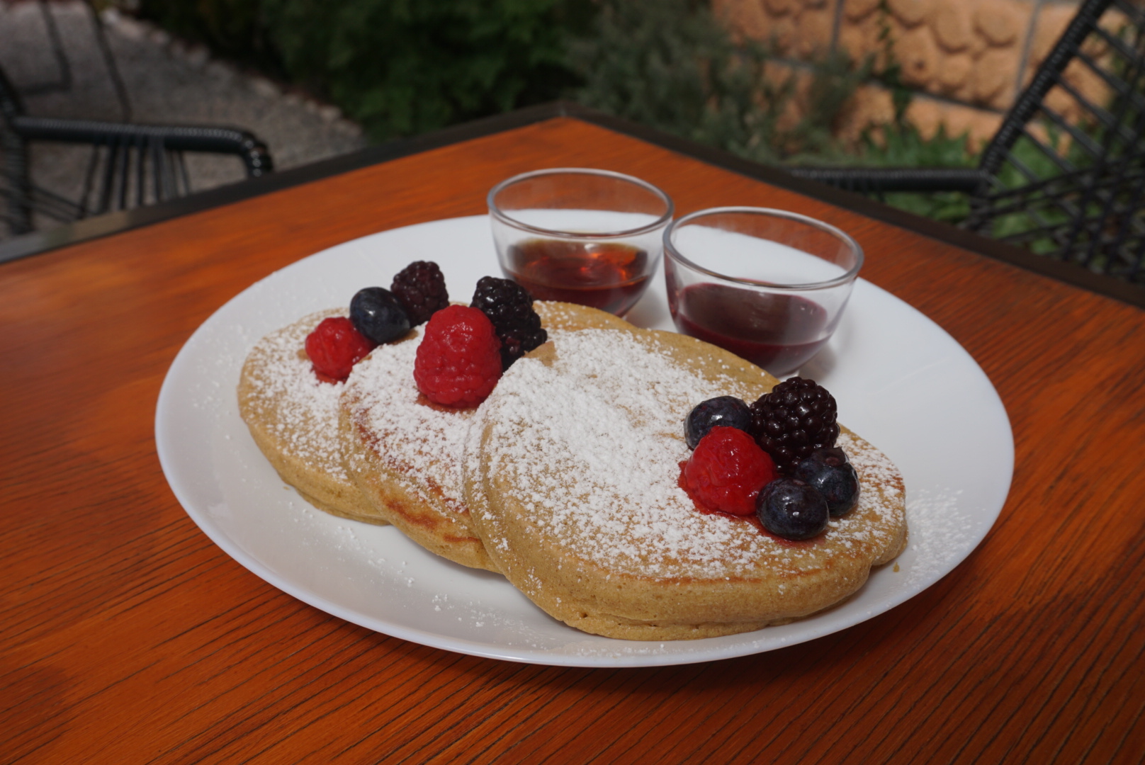 Hechos en casa al momento, servidos con fruta de temporada y miel maple.