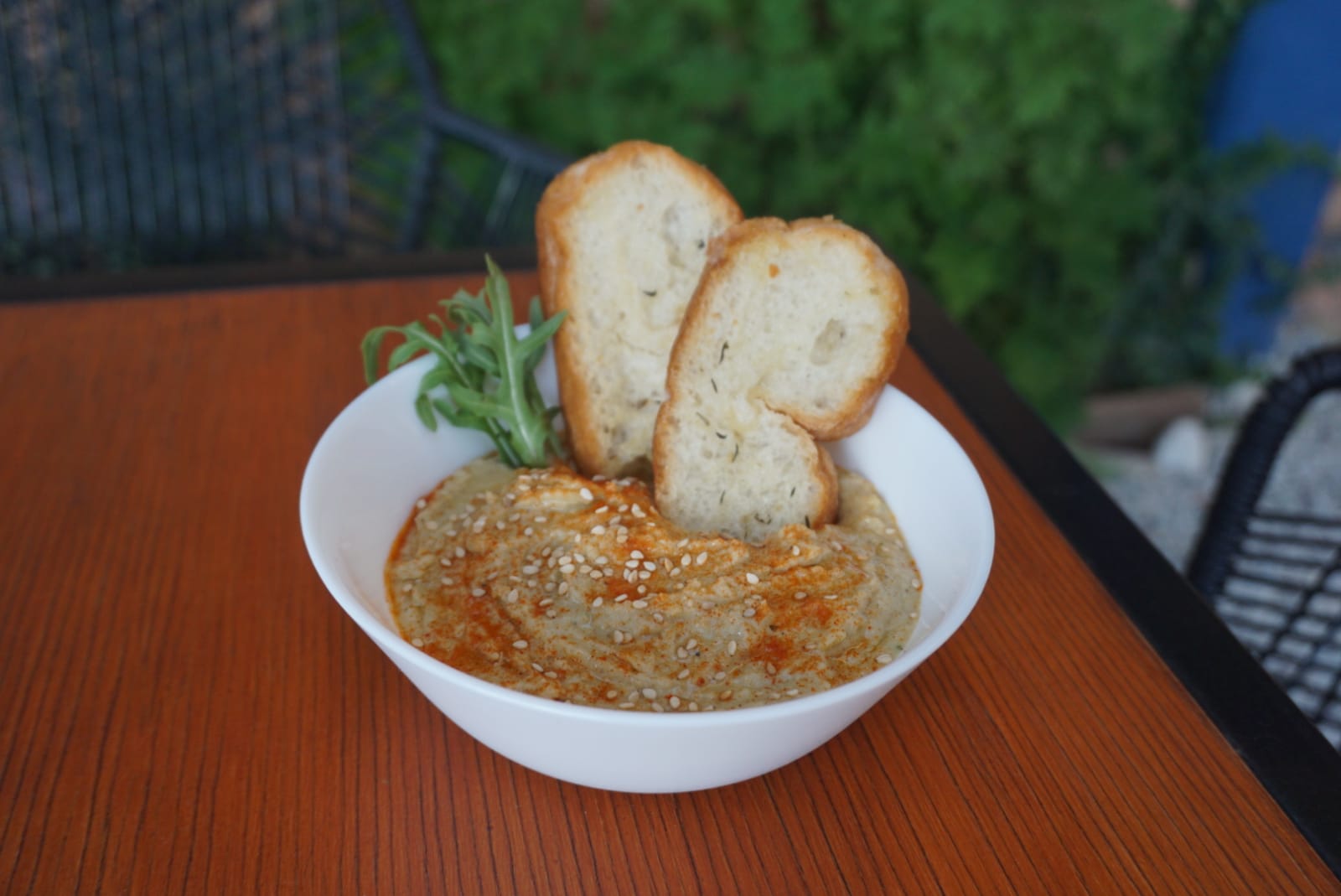 Puré de garbanzos cocidos con jugo de limón, ajonjolí, ajo y aceite de oliva. Servido con pan pita de la casa y pan de ajo tostado.