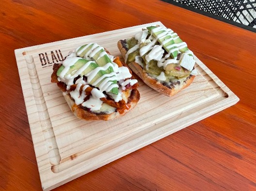 Pan tostado con frijolitos refritos, queso gouda gratinado y pico de gallo.