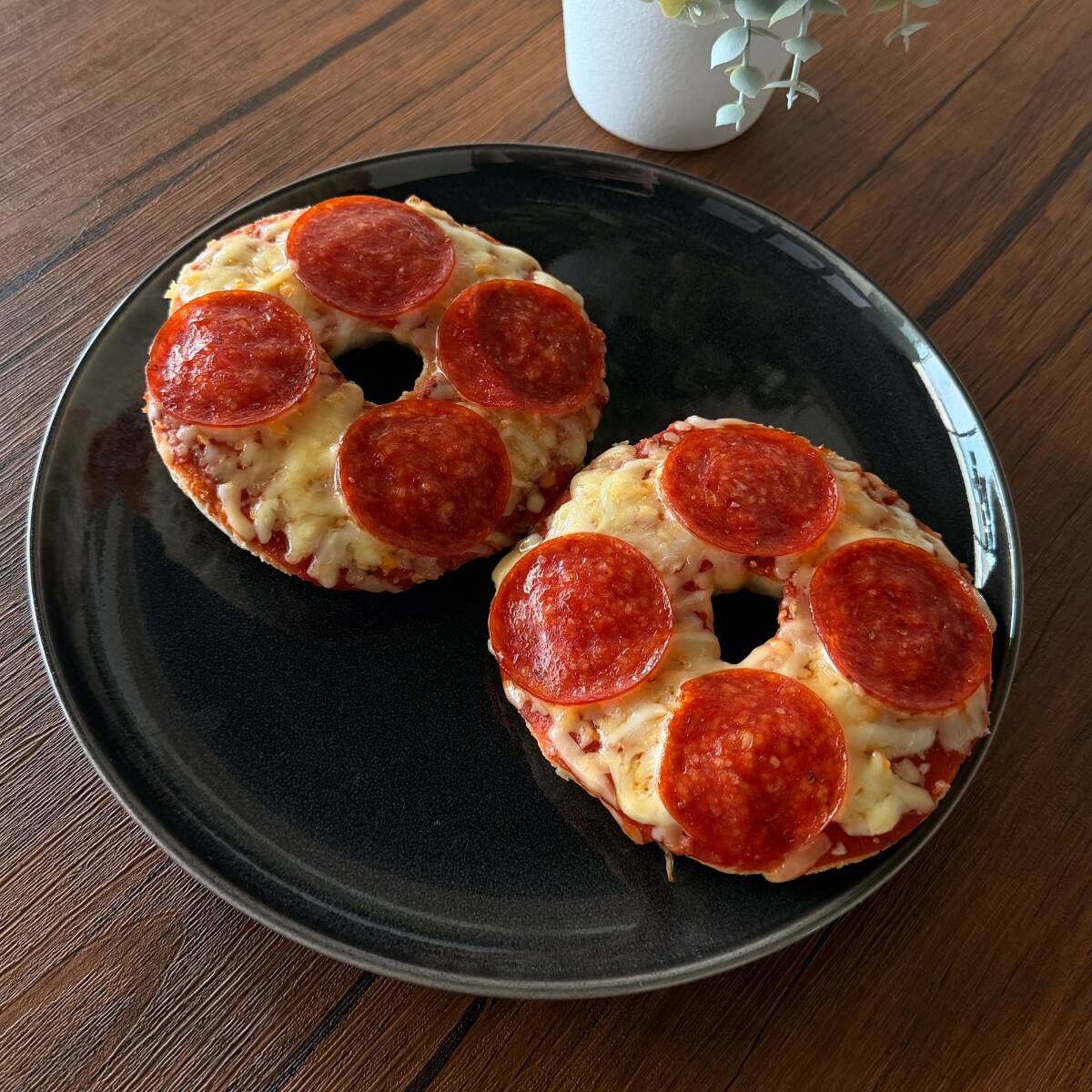 Bagel caliente con salsa de tomate, queso mozzarella fundido y pepperoni