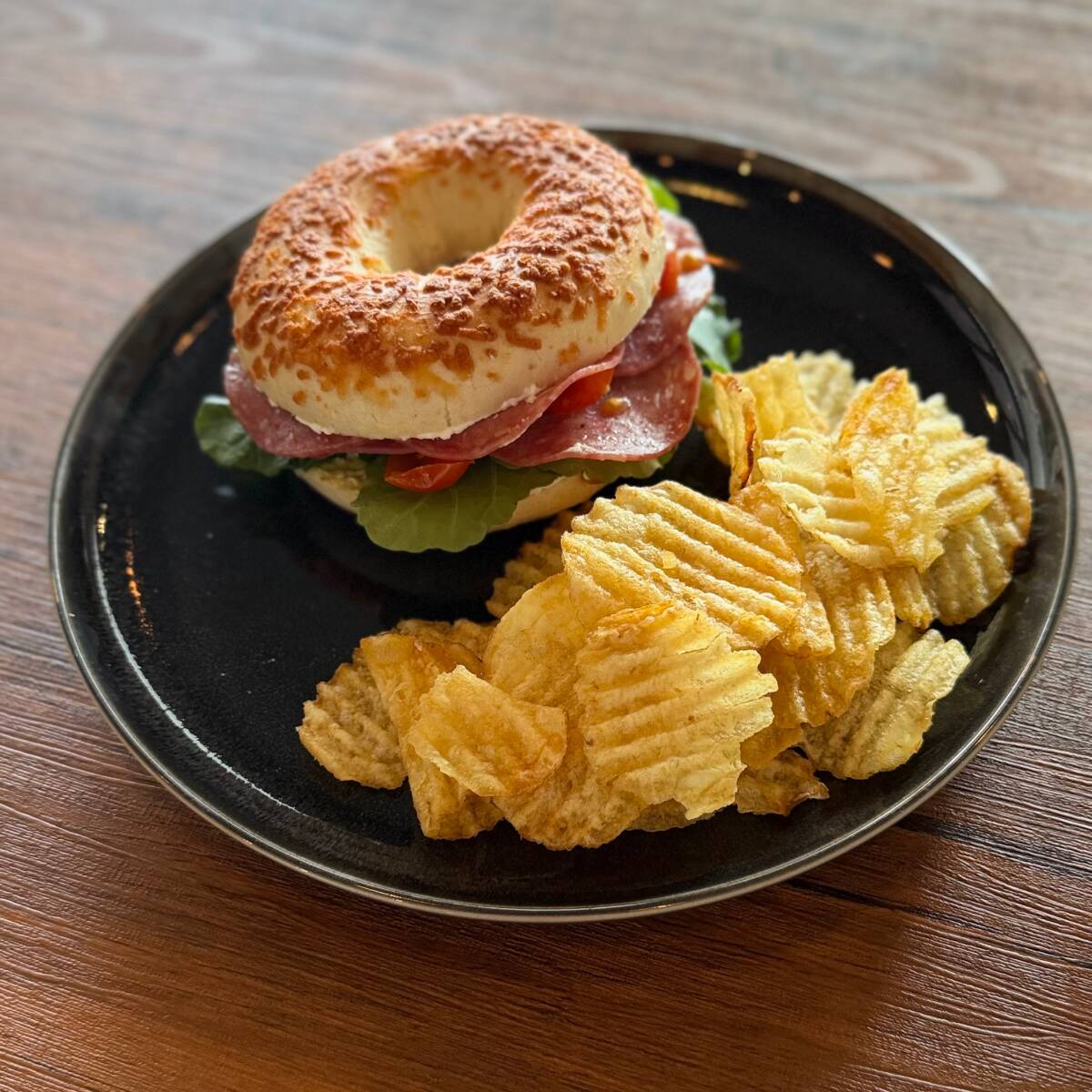 Bagel con una capa de queso crema, salami, arúgula, tomate cherry y un toque de salsa pesto. acompañado de papas