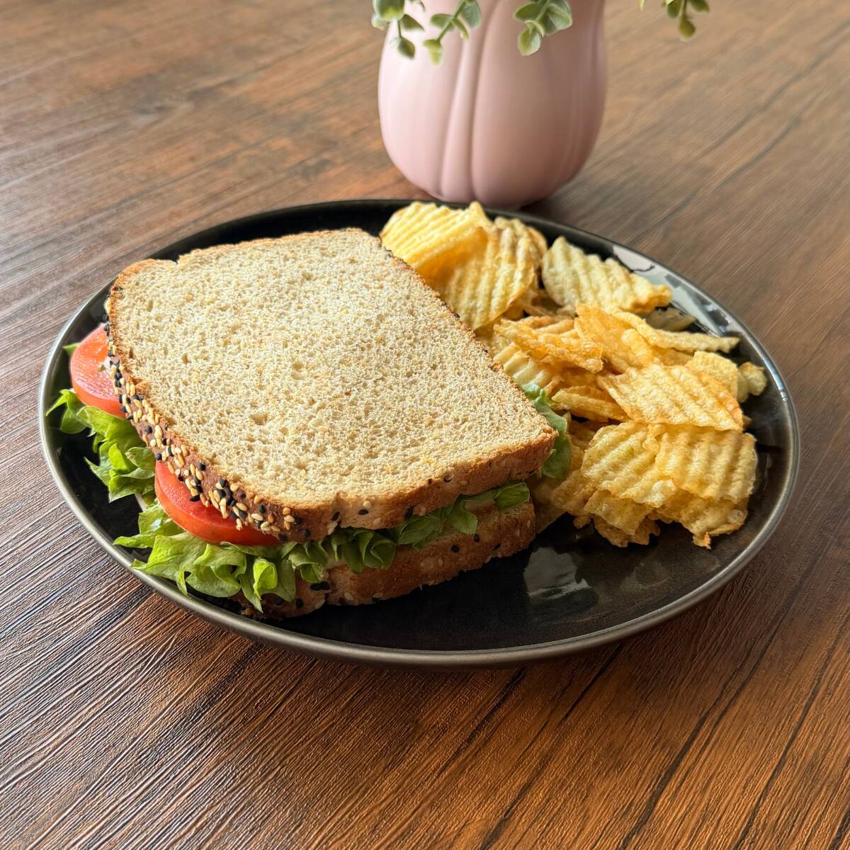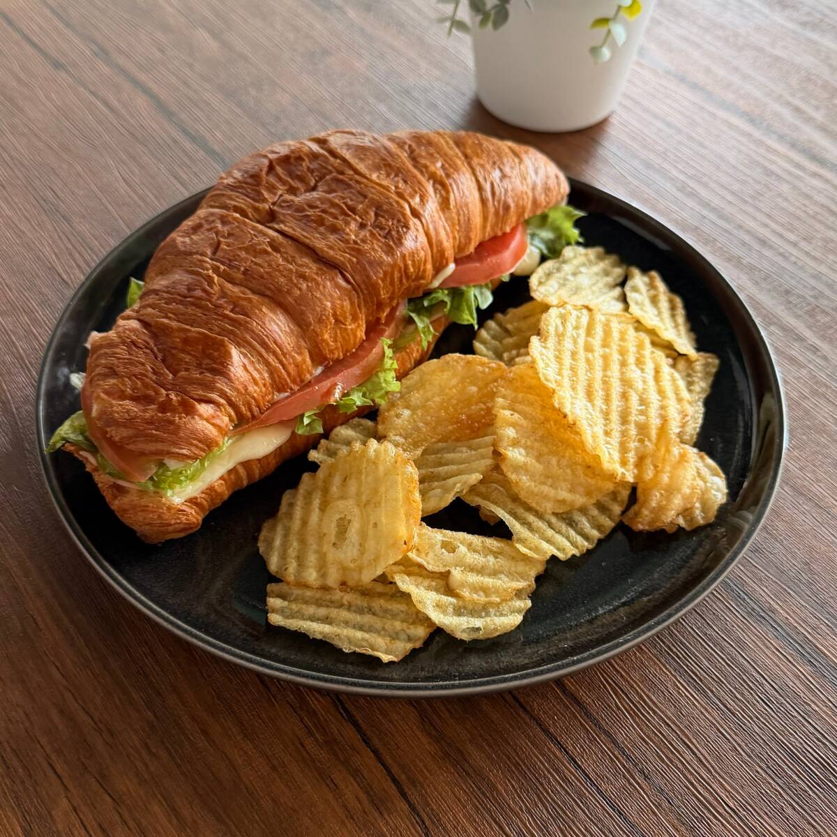 Croissant relleno de jamón de pavo, queso manchego, lechuga, jitomate, acompañado de porción de papas