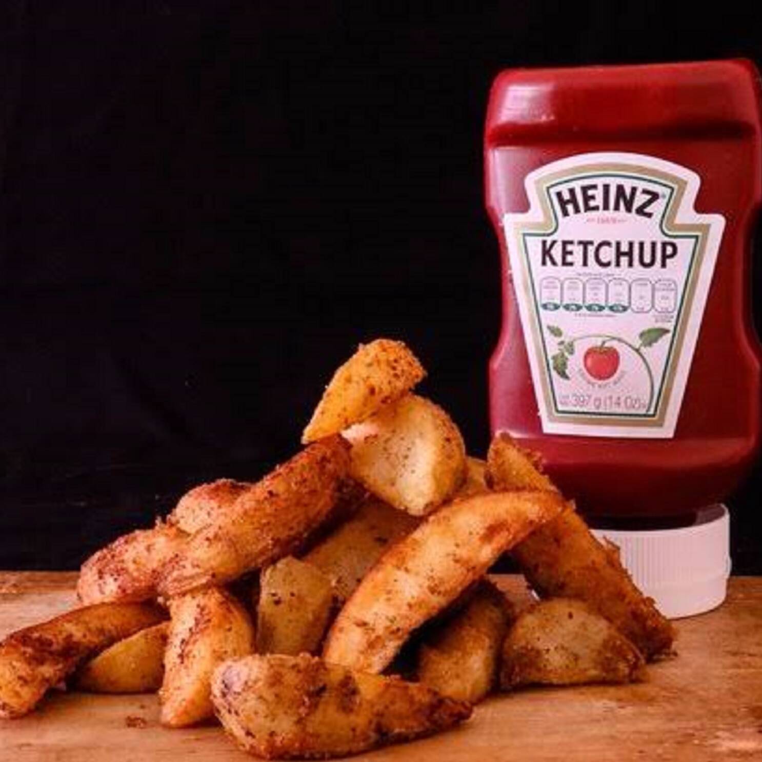 Papas corte gajo sazonadas con deliciosa receta de la casa acompañadas con su dip de queso amarillo y cátsup.