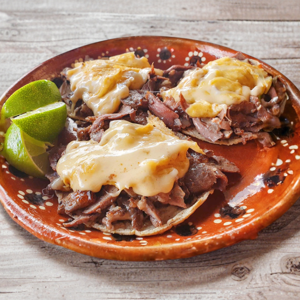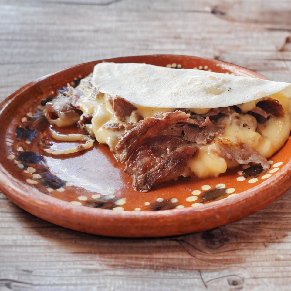 50 gramos de sirloin con 40 gramos de queso gouda gratinado servidos en una tortilla de maíz.