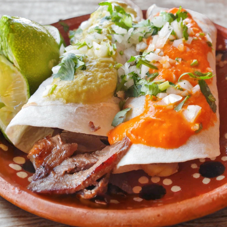 120 gramos de delicioso top sirloin importado, tiernamente envueltos en tortilla de harina casera.