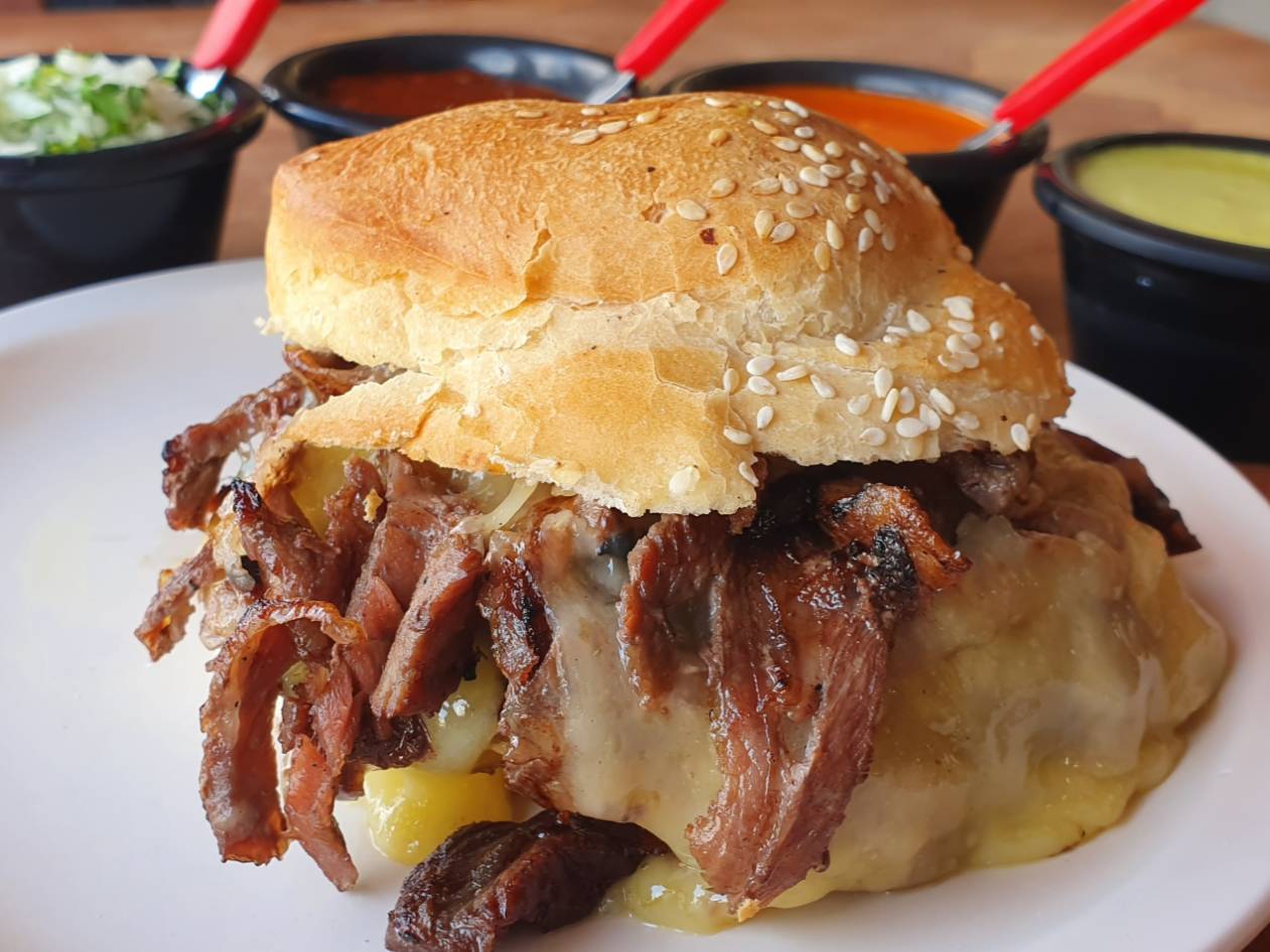 100 gramos de sirloin y 60 gramos de queso gouda gratinado.