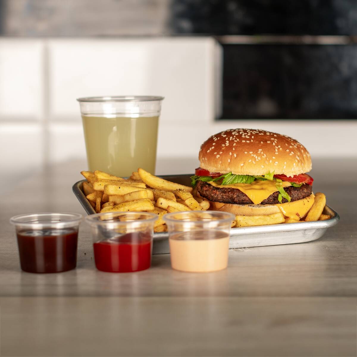 Doble jugosa carne de res (2×150 g) en pan brioche dorado, con aderezo Tasty, doble queso americano, lechuga fresca y jitomate. Un monstruo de sabor que sí llena. Incluye papas sazonadas y agua de sabor.