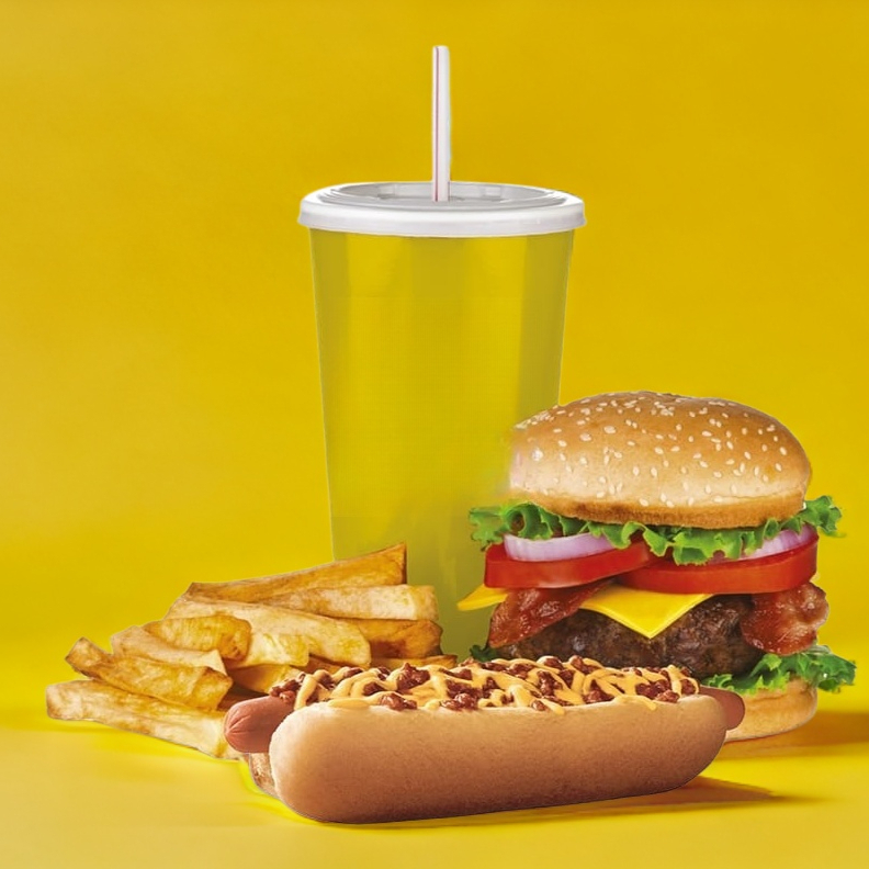 Este es un platillo personal, el cual incluye: Hamburguesa sencilla con queso, pan, lechuga, jitomate, cebolla y carne de res+ bebida de 600 mililitros ( Pepsi, seven, mirinda)