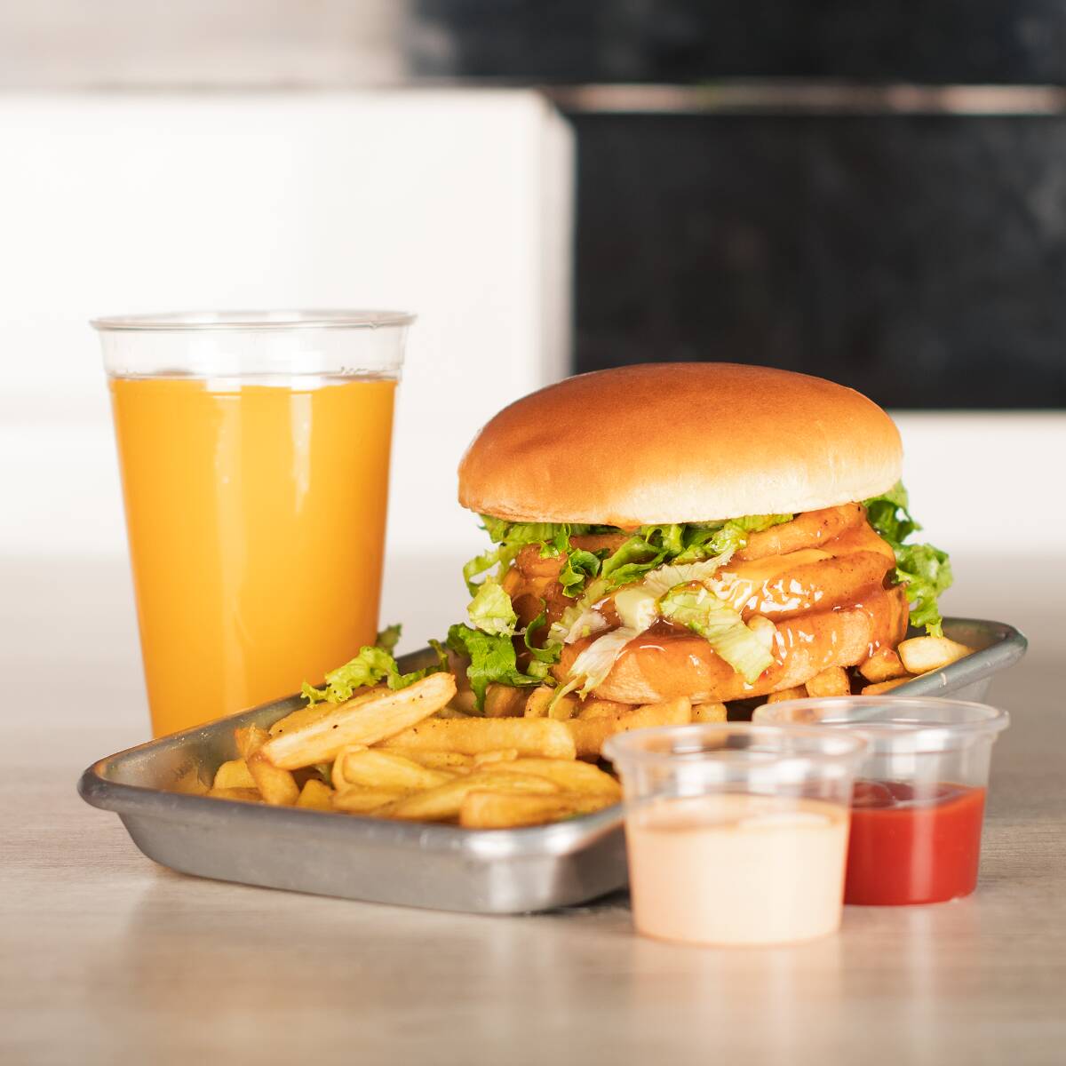 Hamburguesa de pollo 100% crujiente en pan brioche dorado, con nuestra salsa agridulce spicy, doble aro de cebolla, queso americano, lechuga y jitomate. Crujiente por fuera, jugosa por dentro.