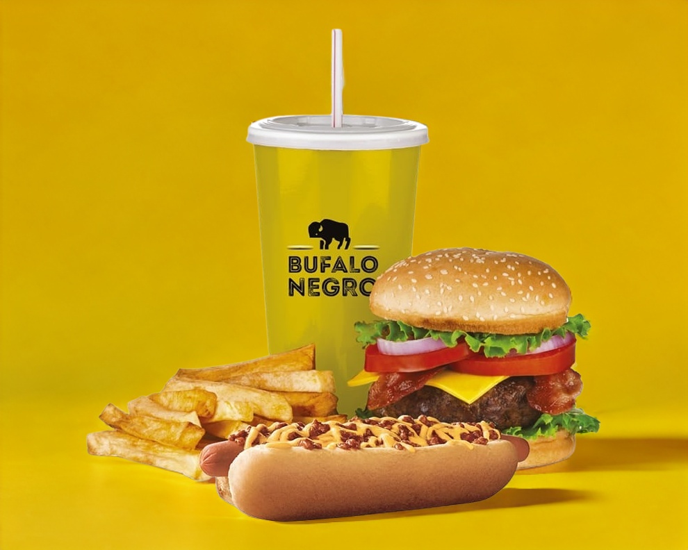 Búfalo 1: Hamburguesa+Papas y Refresco o Agua.