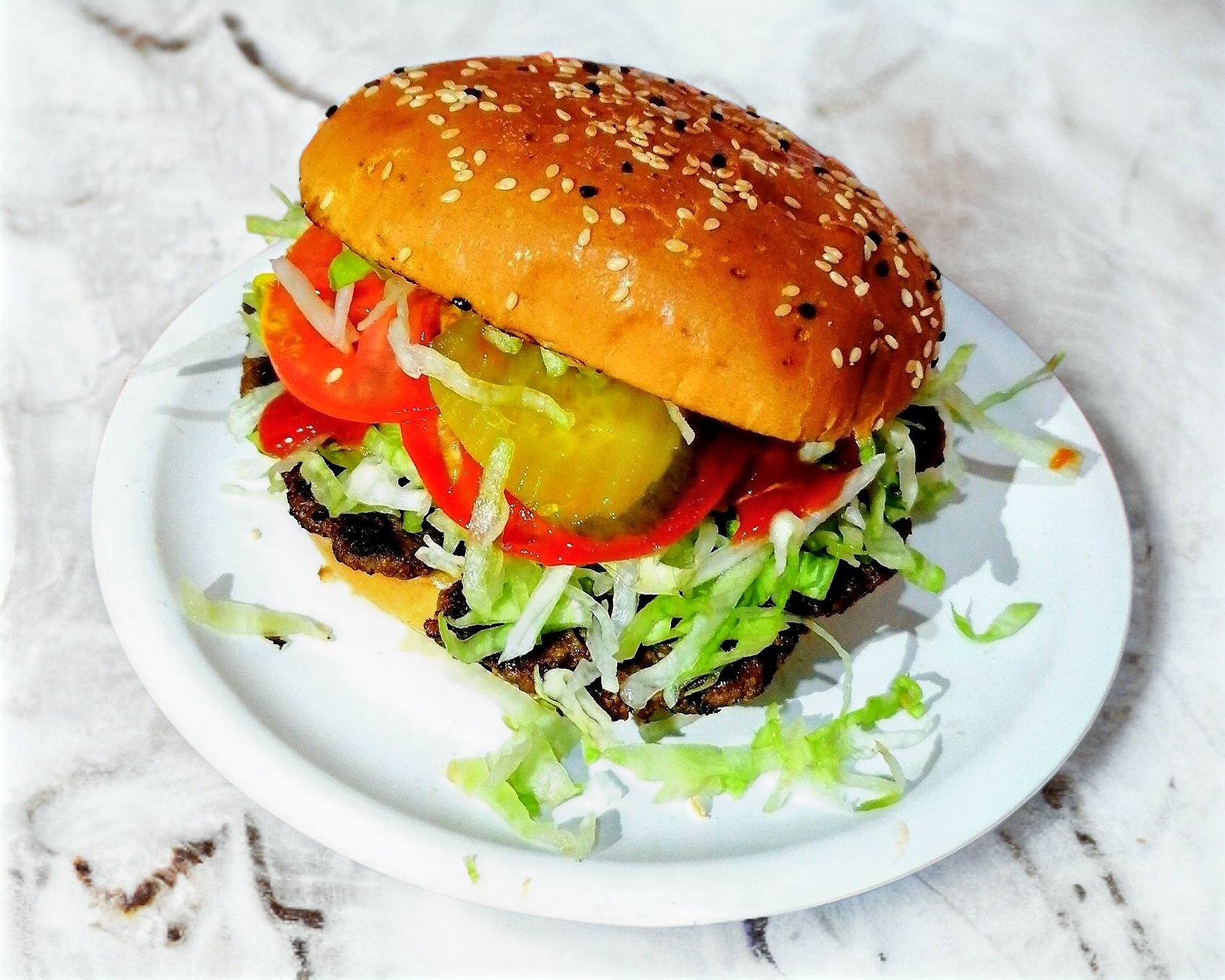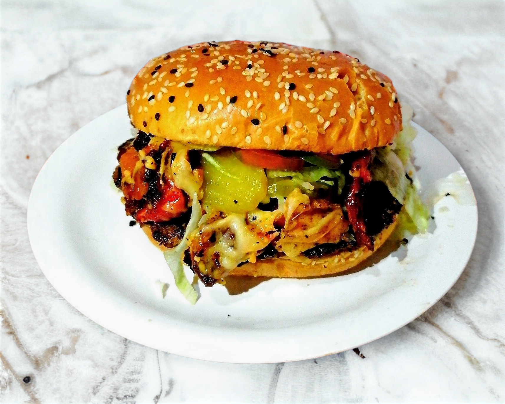 carne de hamburguesa casera, jitomate, lechuga, pepinillo, rajas verdes caseras
