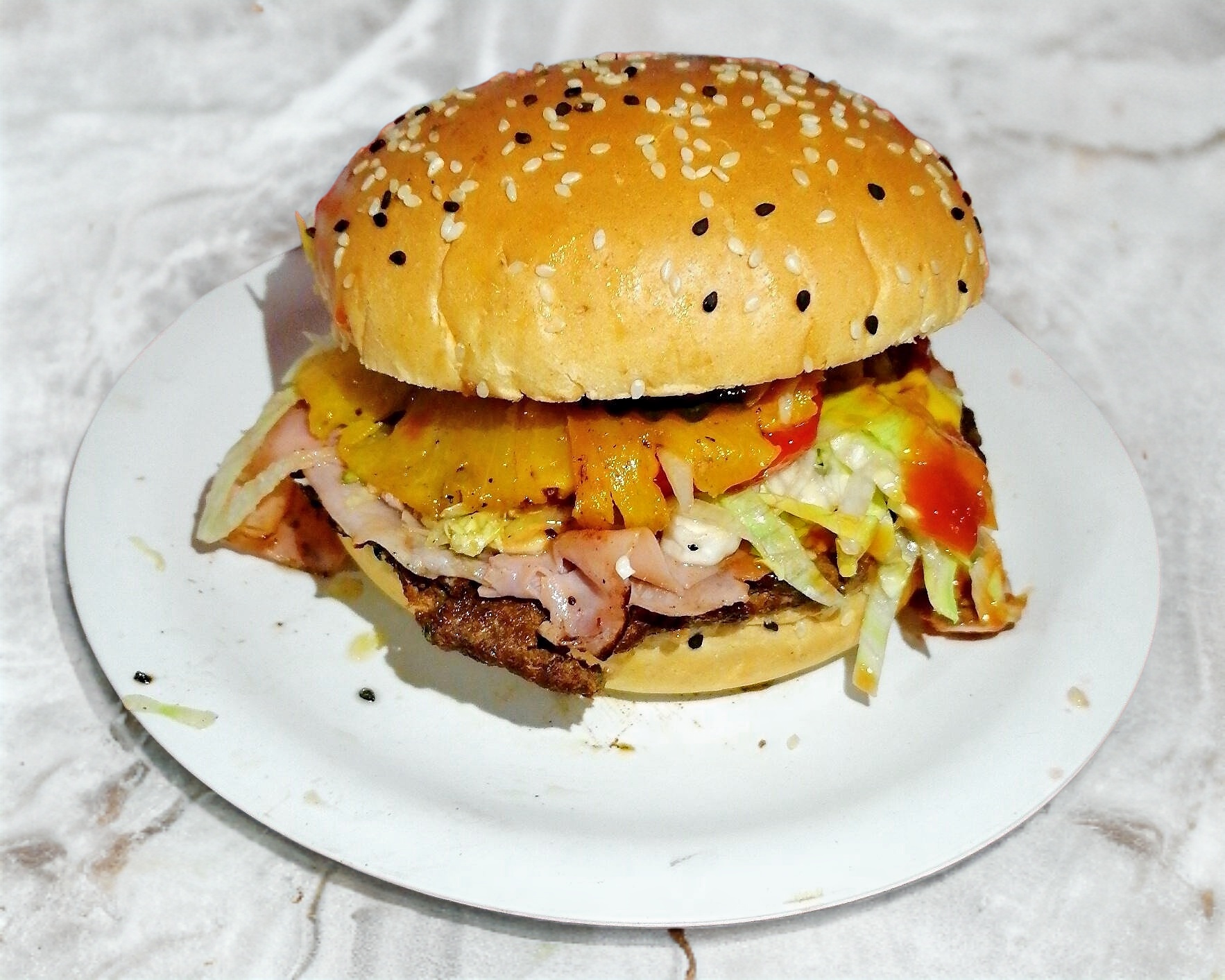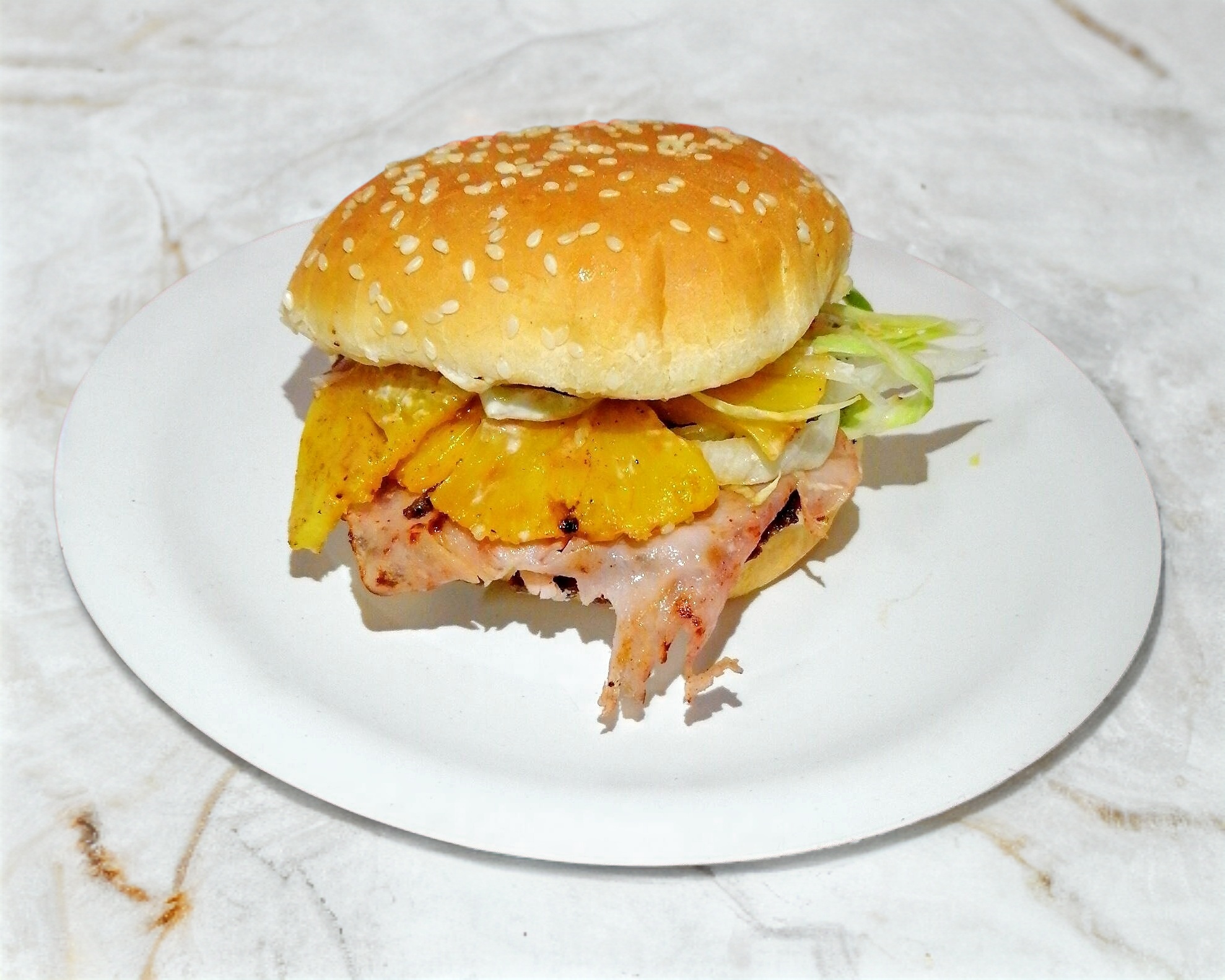 Carne de hamburguesa, jitomate, lechuga, piña, quesillo, jamon de pavo