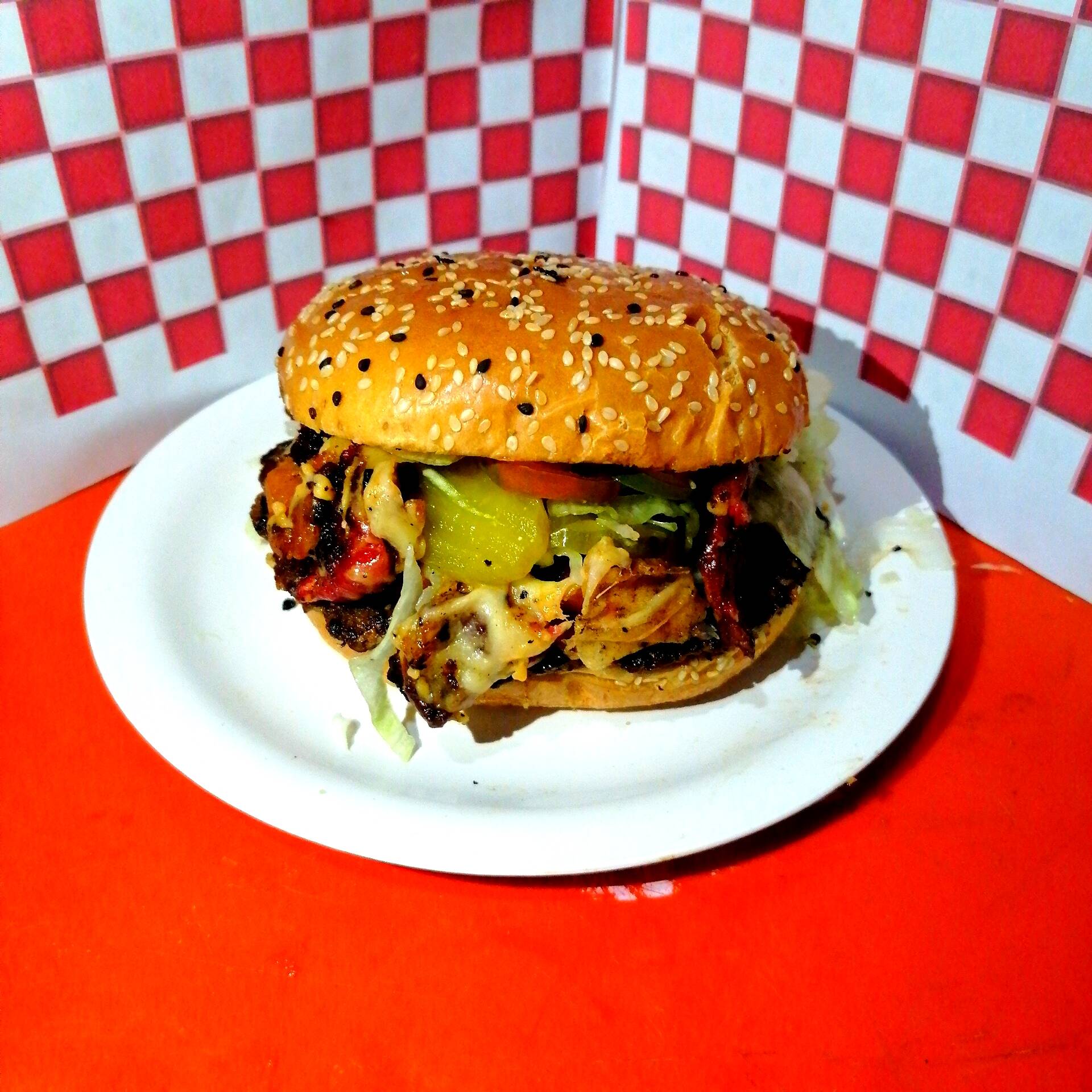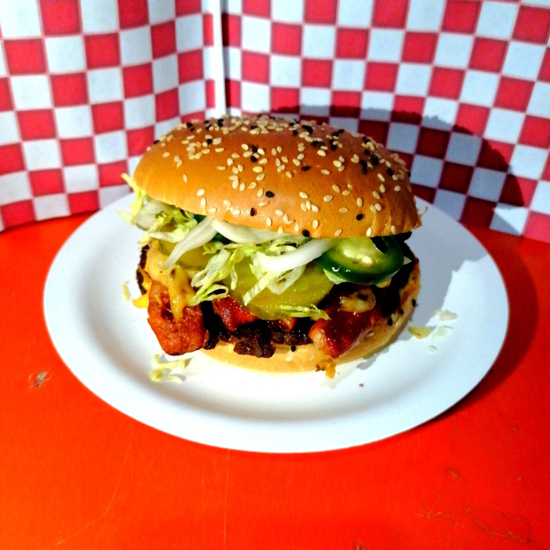Carne de hamburguesa casera, pepinillo, jitomate, lechuga, chorizo español, queso derretido, rajas verdes caseras