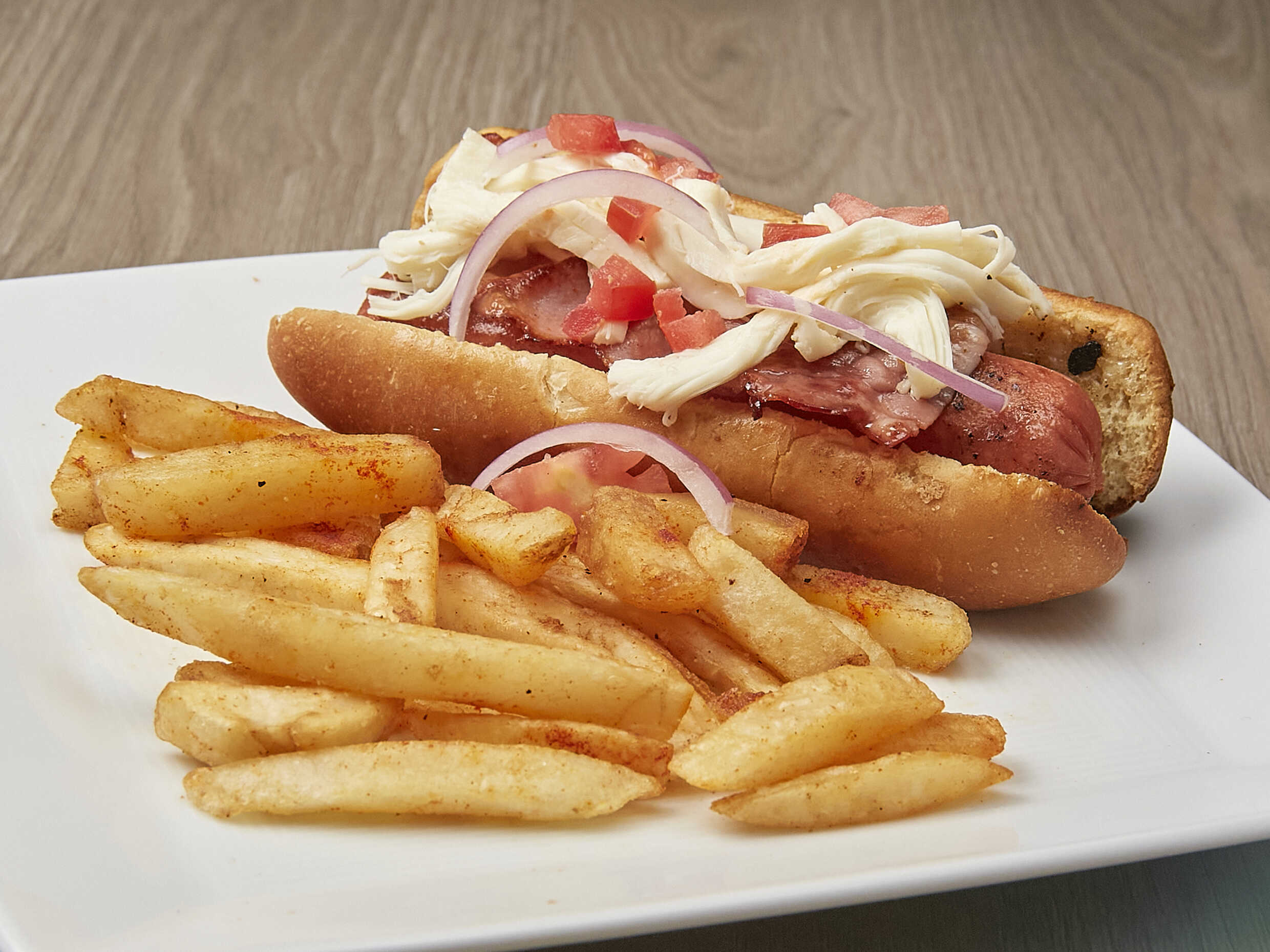 Salchicha, tocino, quesillo, jitomate, cebolla y jalapeño.