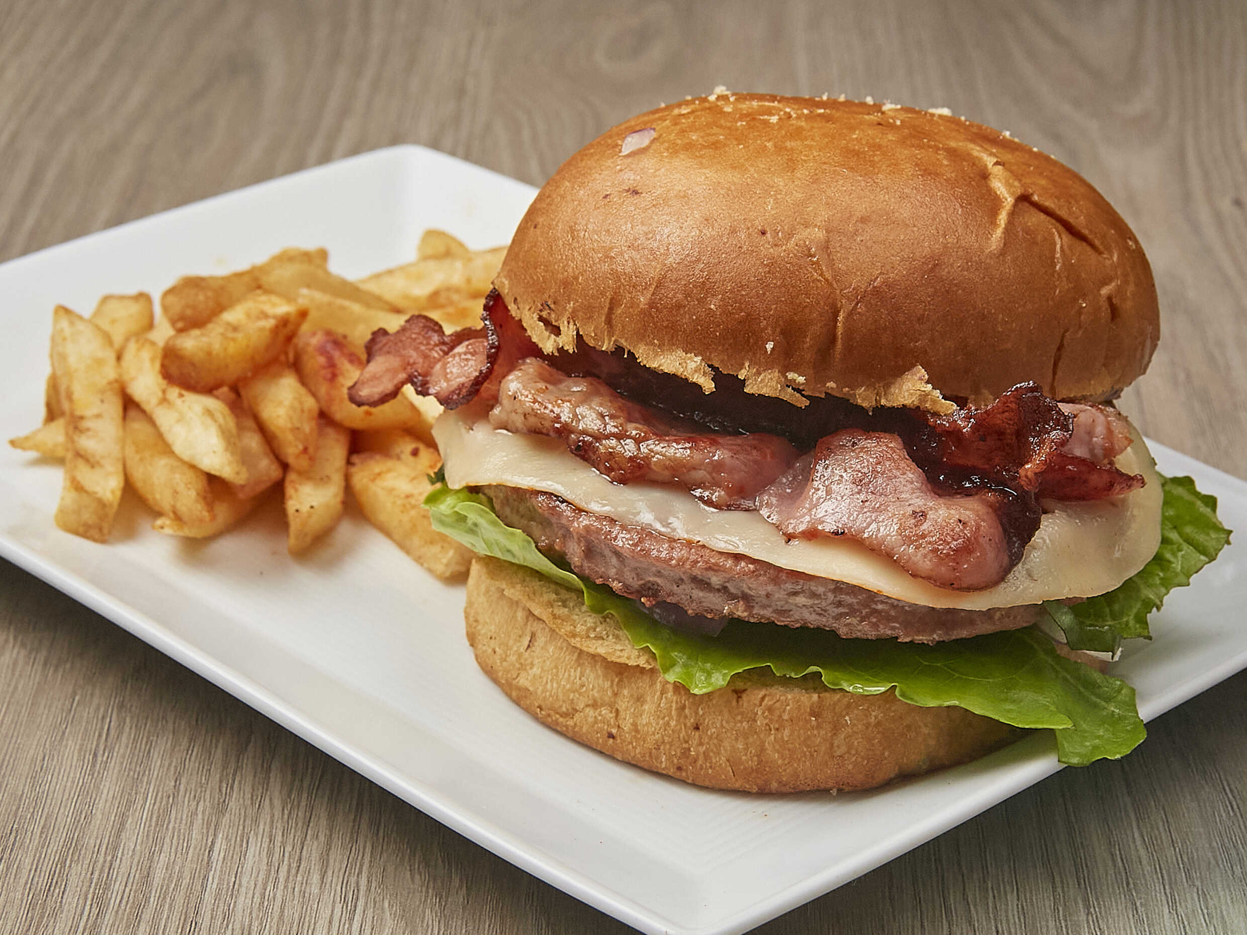 Carne de sirloin, queso manchego, tocino, cebolla acitronada.