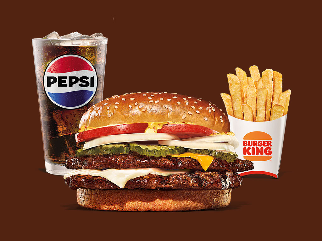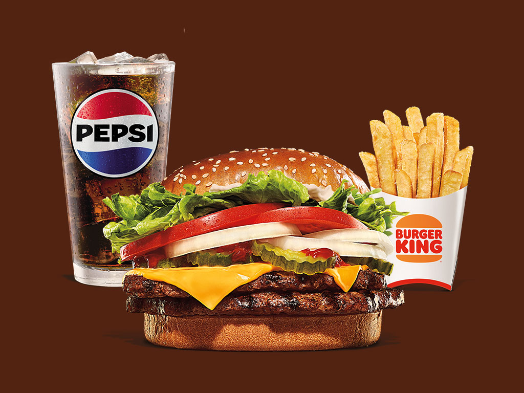 La hamburguesa favorita de muchos, la tradicional Whopper® Doble con 2 carnes de res a la parrilla, 2 rebanadas de queso americano, jitomates frescos, lechuga, mayonesa, ketchup, pepinillos crujientes y cebolla blanca en rodajas, sobre un pan ligeramente tostado con semillas de ajonjolí. Acompañada de papas y refresco.