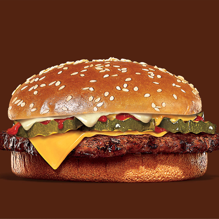 Los básicos del Rey. Deliciosa carne a la parrilla cubierta con queso americano derretido, ketchup, un toque de mostaza y pepinillos, sobre un pan suave con ajonjolí.
