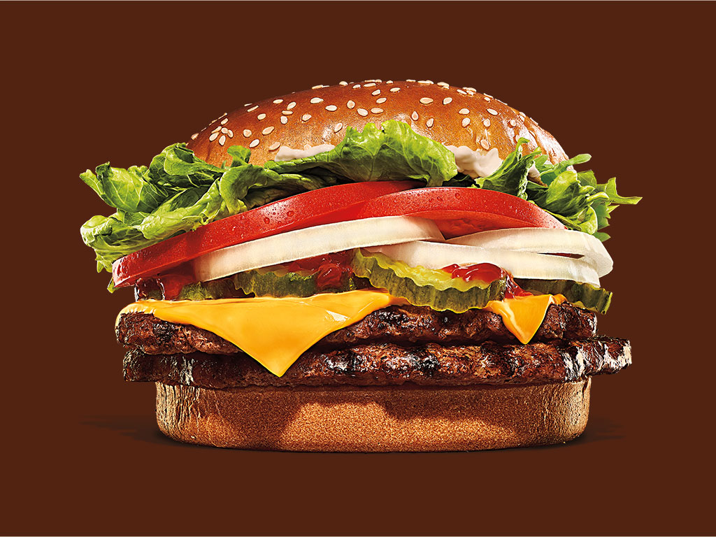 La hamburguesa favorita de muchos, la tradicional Whopper Doble con 2 carnes de res a la parrilla, 2 rebanadas de queso americano, jitomates frescos, lechuga, mayonesa, ketchup, pepinillos crujientes y cebolla blanca en rodajas, sobre un pan ligeramente tostado con semillas de ajonjolí.