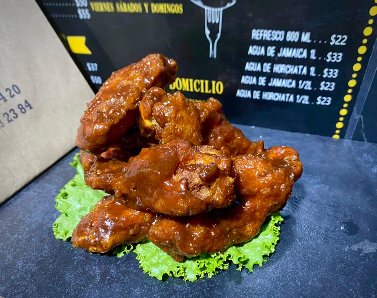 1 kilo de nuestras alitas de pollo fritas, que las puedes acompañas con tu aderezo de preferencia (mango habanero, ranch, BBQ y búfalo).