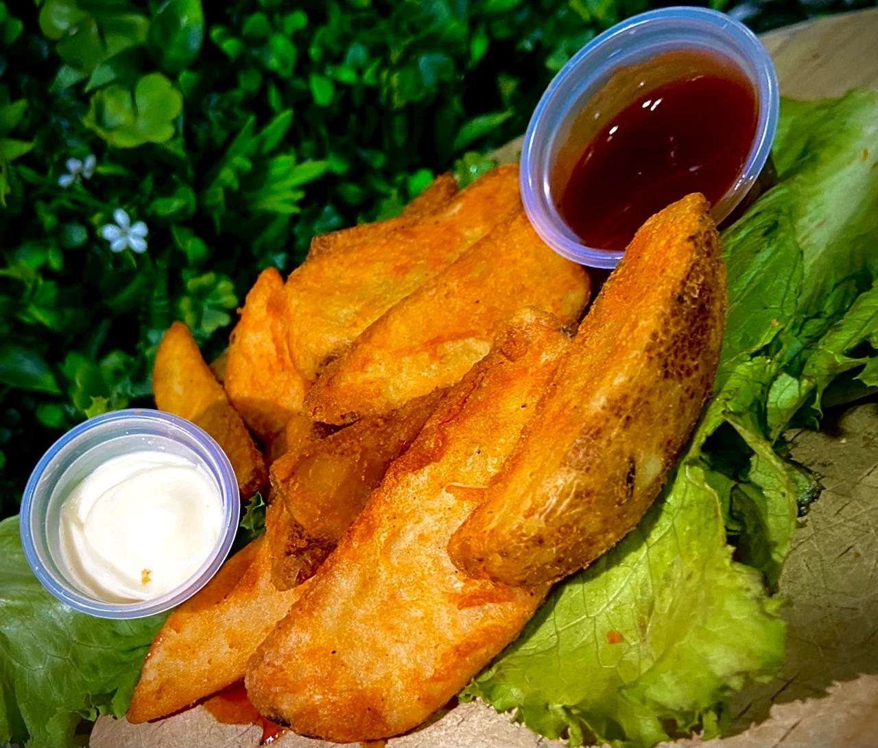 Deliciosas papas tipo gajo, acompañada de queso americano y aderezos.