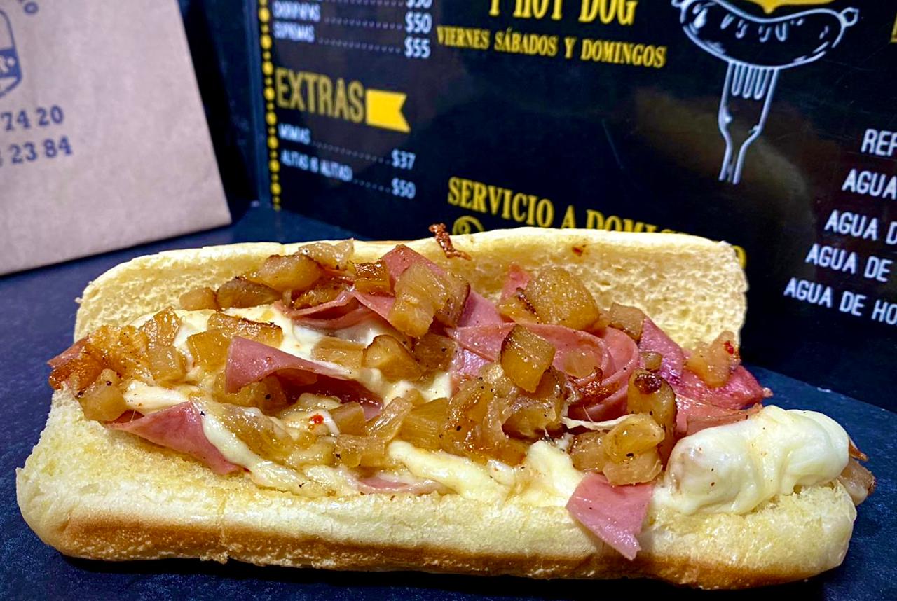 Deliciosa salchicha de pavo, acompañada de quesillo, jamón, piña, jitomate, zanahoria, aderezos y picante de la casa.