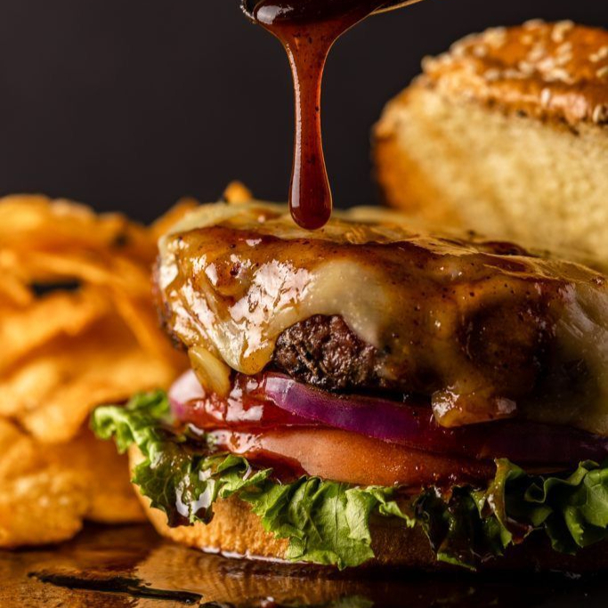 Carne de res, queso americano, cátsup, mostaza, picante, cebolla, lechuga, mayonesa, jamón, BBQ y queso mozzarella.