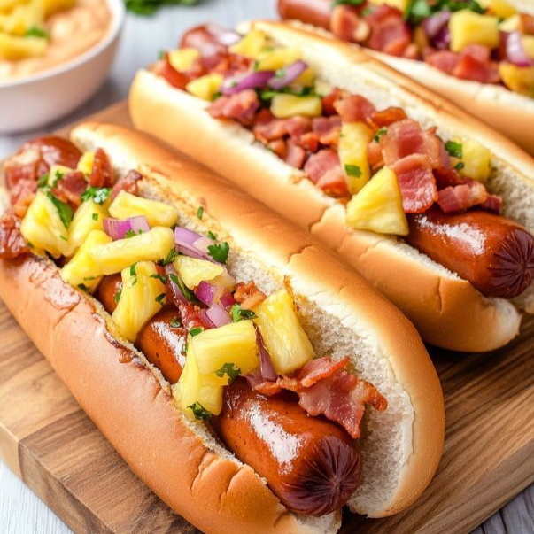 Pan brioche, doble salchicha gigante, mayonesa, tocino, cátsup, mostaza, picante, cebolla, jitomate, piña asada, champiñones, BBQ, mozzarella y piña.