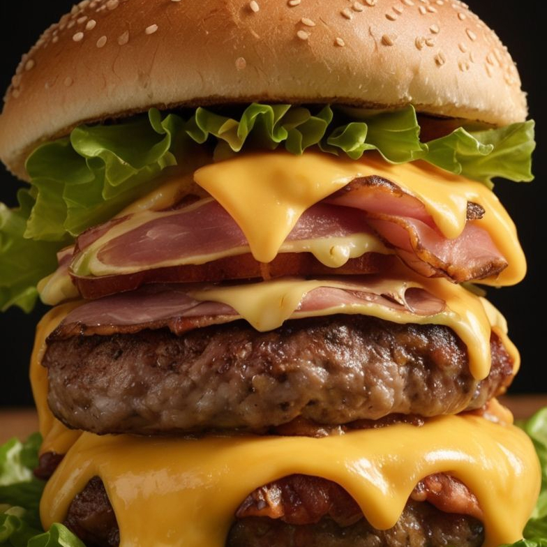 Doble carne de res, queso americano, cátsup, mostaza, picante, cebolla, lechuga, mayonesa, jamón y queso mozzarella.