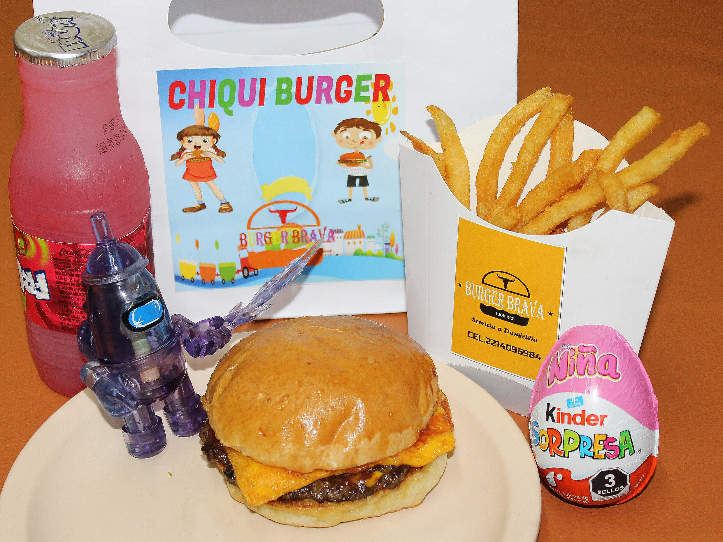 Hamburguesa kids, papas kids, huevo kinder sorpresa y frutsi