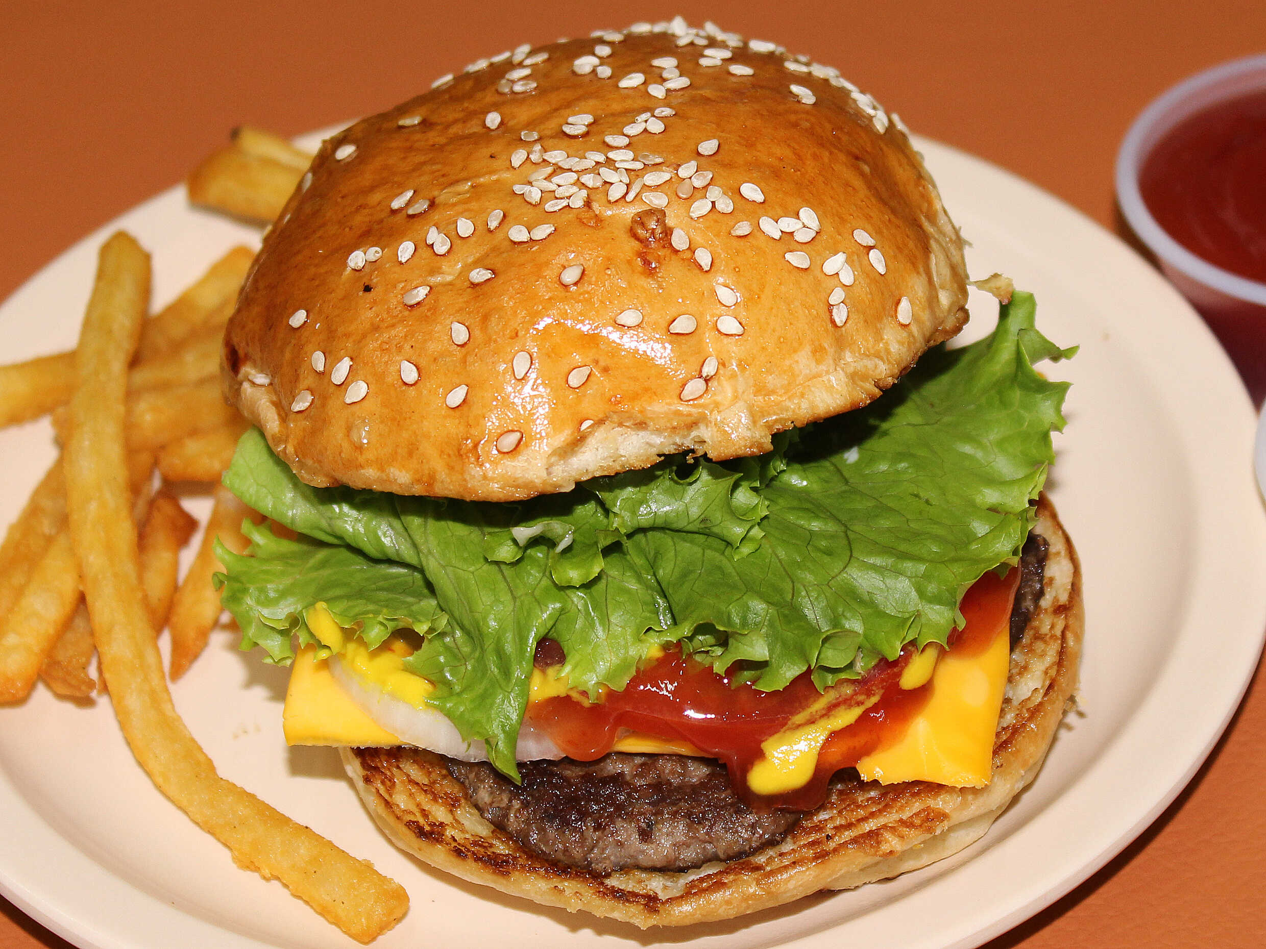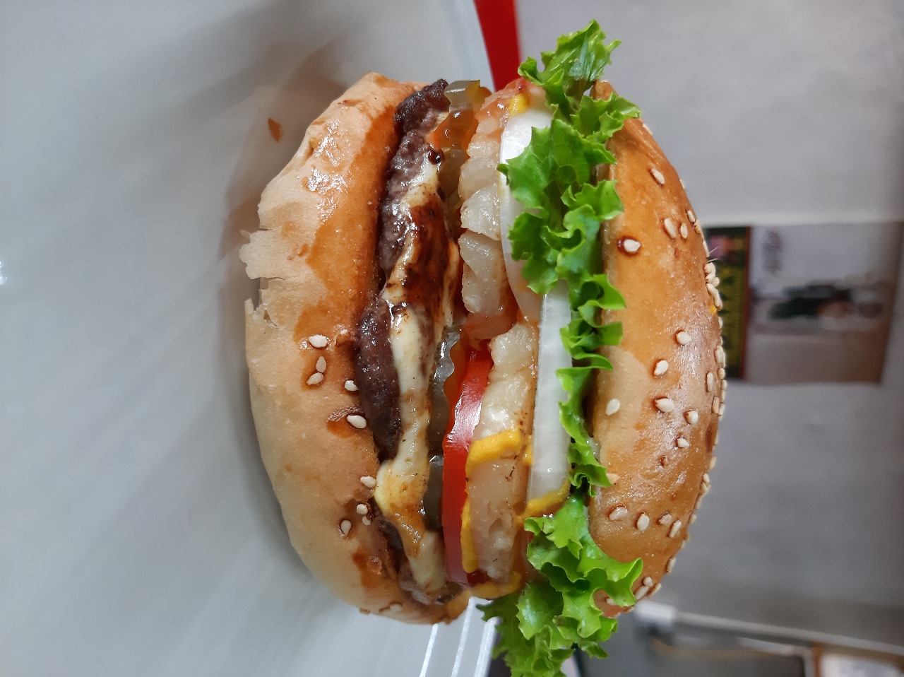 Carne de 180 gr. Lechuga, mayonesa, catsup, mostaza, jitomate, cebolla, pepinillos, jalapeños y queso americano.