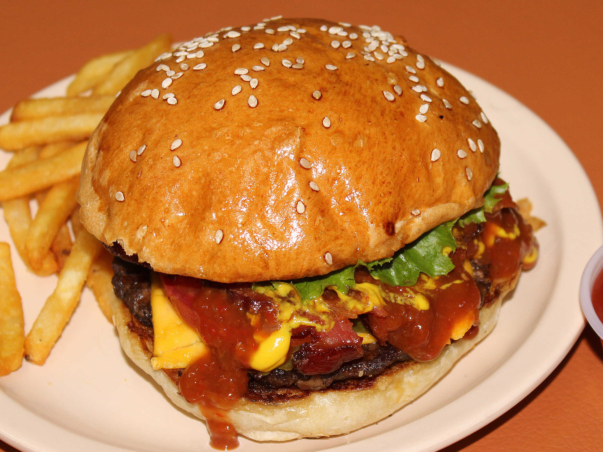 Aderezo de ajo, tocino, mermelada de habanero, queso americano, lechuga, jitomate, pepinillos y mostaza.