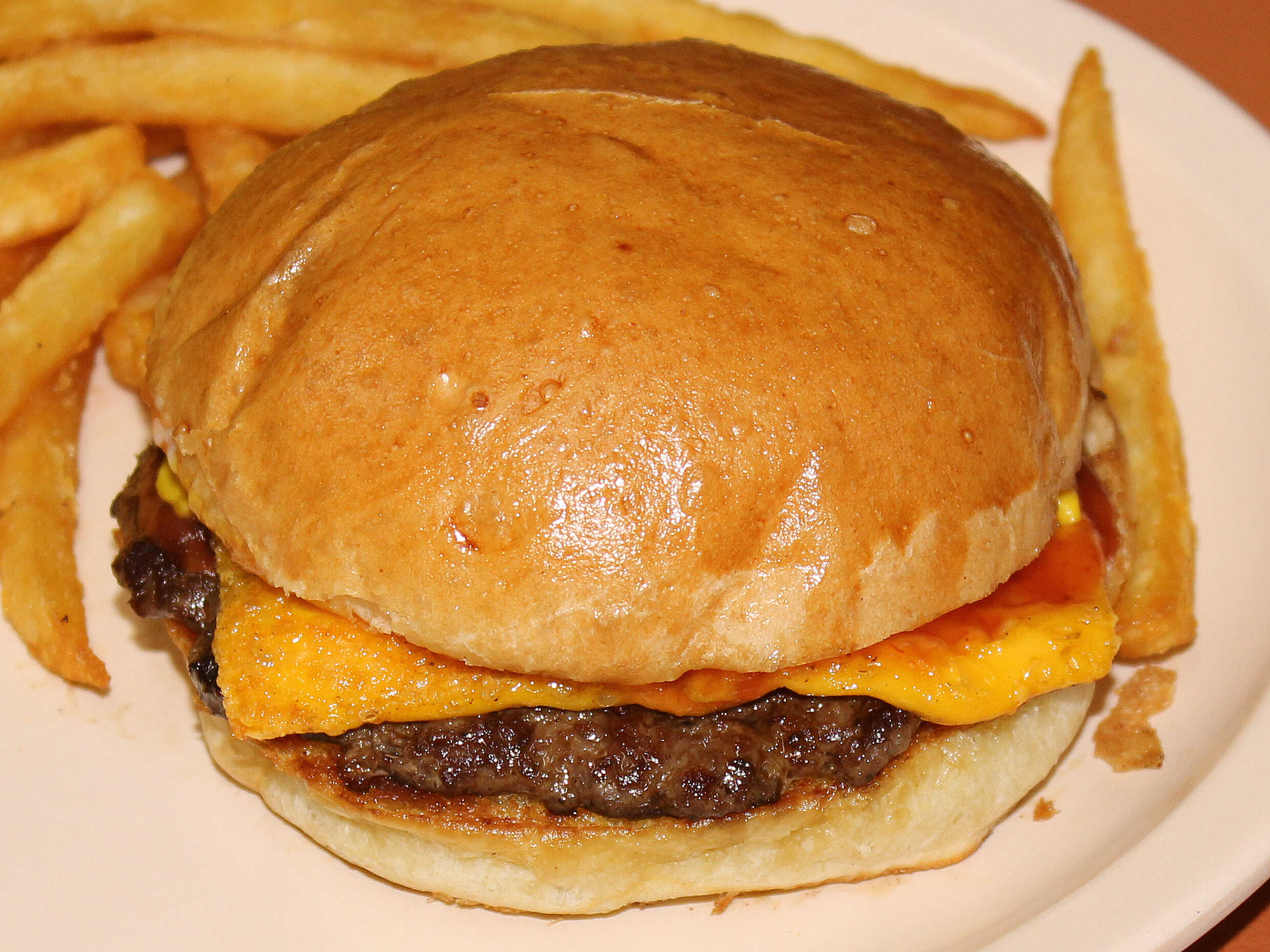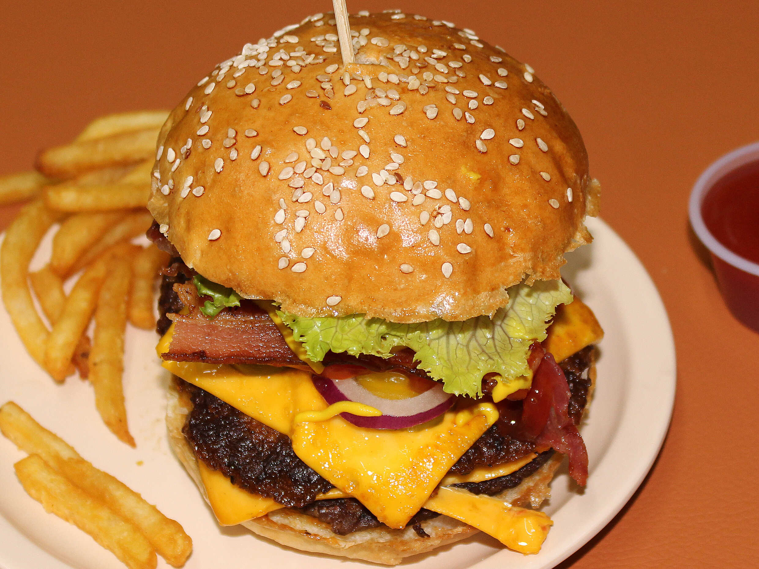 Carne 180 g, tocino crujiente, doble queso americano, verduras y aderezos.