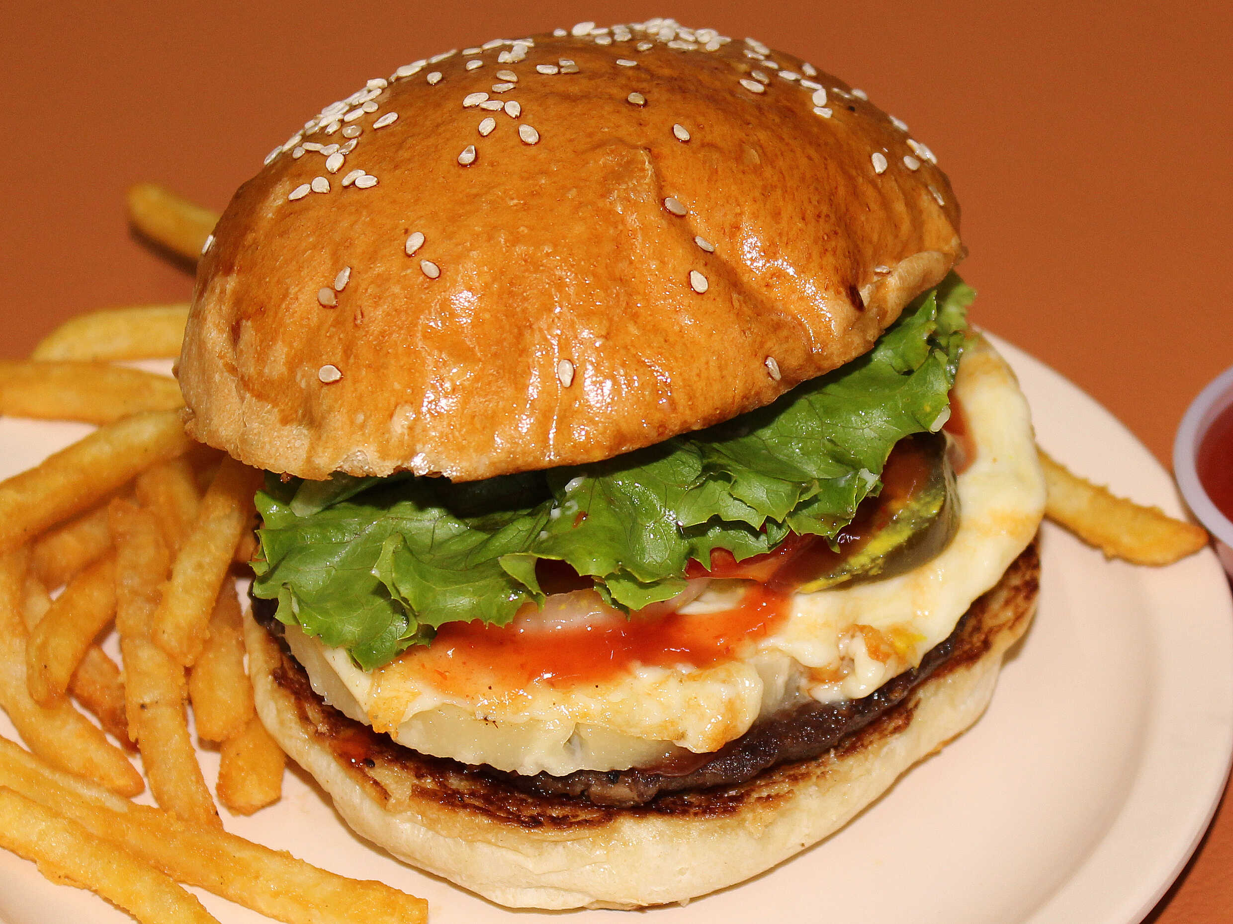 Carne de 180 g, queso fundido, piña, verduras y aderezos.