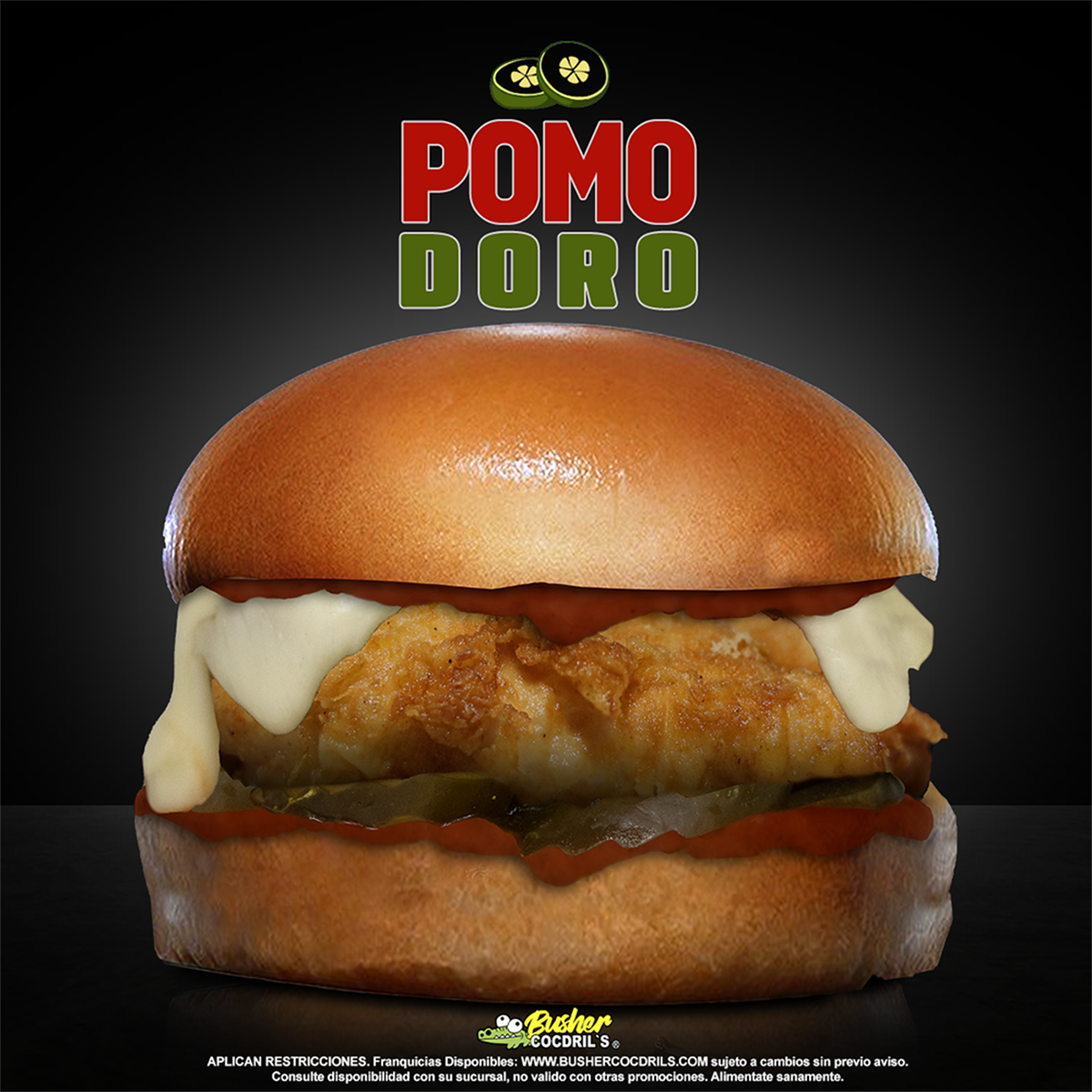 Deliciosa hamburguesa a base de pechuga de pollo 150 g, acompañada de aderezo pomodoro, una capa de queso gratinado y pepinillos.